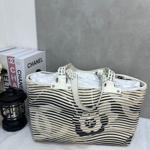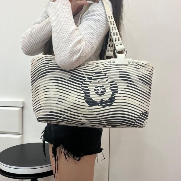 Chanel這款條紋山茶花托特包,帆布材質+黑白條紋,點綴經典山茶花和雙C標誌,簡約又有辨識度。大容量設計,能裝下筆記本電腦、A4文件,通勤、上學、短途出行都超實用!手提帶+編織細節,質感滿分,內襯乾淨,附保存袋,適合中古市場收藏或日常搭配,實用與時尚兼具,真的很推薦!