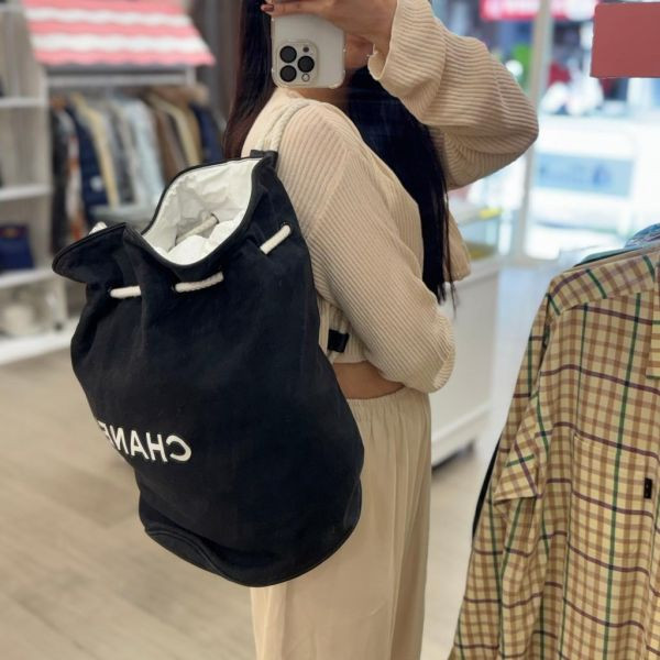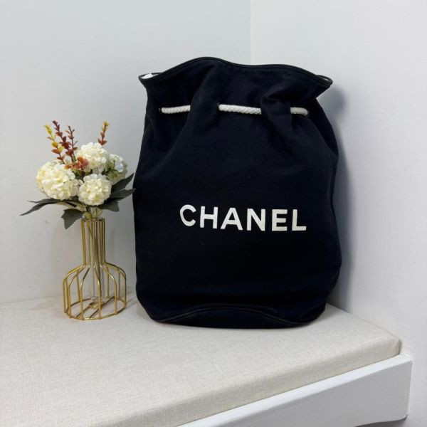 這款 CHANEL 帆布束口袋,採用簡約經典的設計風格,以全黑帆布材質搭配 白色繩索束口,正面印有大大的「CHANEL」品牌字様,簡單又有高級感。
