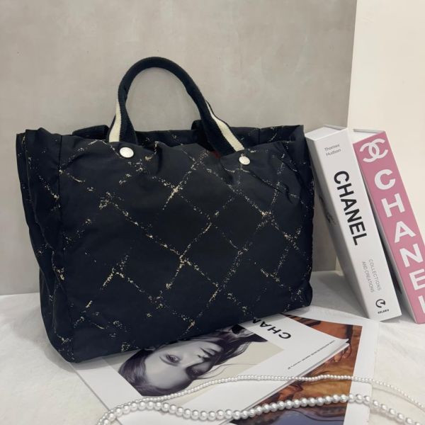 黑色尼龍材質+經典菱格紋,輕便耐用,日常通勤或短途旅行都超適合!容量大,能裝下書本、衣物等,內部有子袋,收納超方便。尼龍防水易清潔,還能折疊進行李箱,實用又時髦!中古市場超受歡迎,兼具收藏價值和實用性,喜歡香奈兒的姐妹別錯過啦~