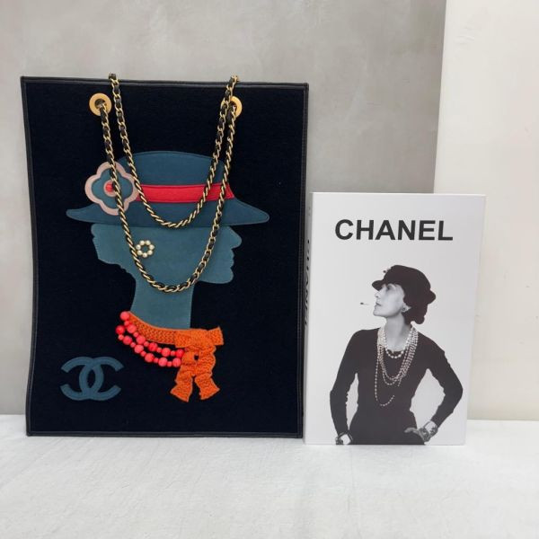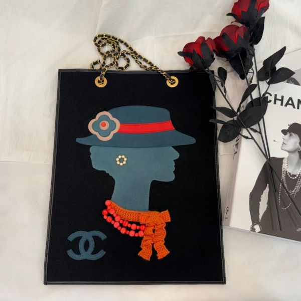 𝐂𝐡𝐚𝐧𝐞𝐥 這款復古藝術手袋,黑色織物搭配藍色側臉剪影,點綴紅帽、橙色圍巾和珊瑚珠鏈,藝術感滿滿。金屬鏈條肩帶+雙C標誌,品牌辨識度超高。靈感源自20世紀初復古風,兼具收藏與實用,超適合復古穿搭或藝術展覽場合,彰顯獨特品味與個性風格!