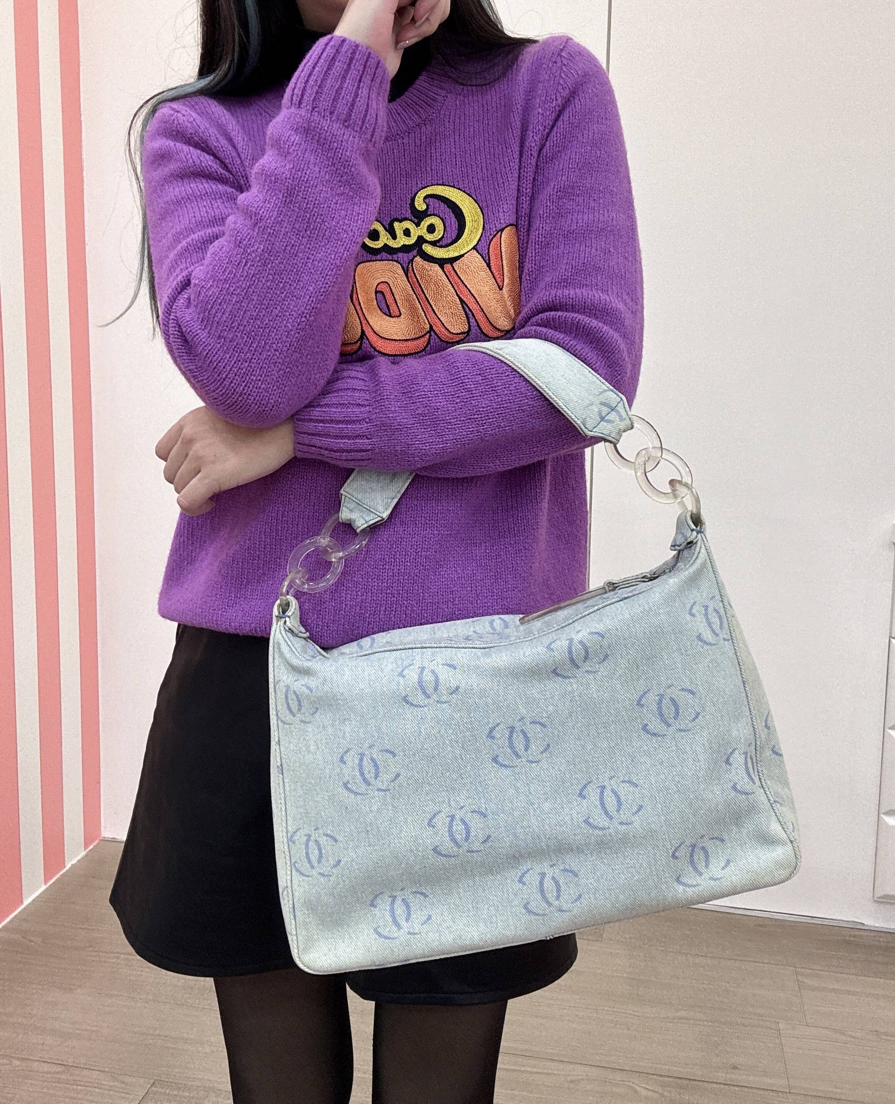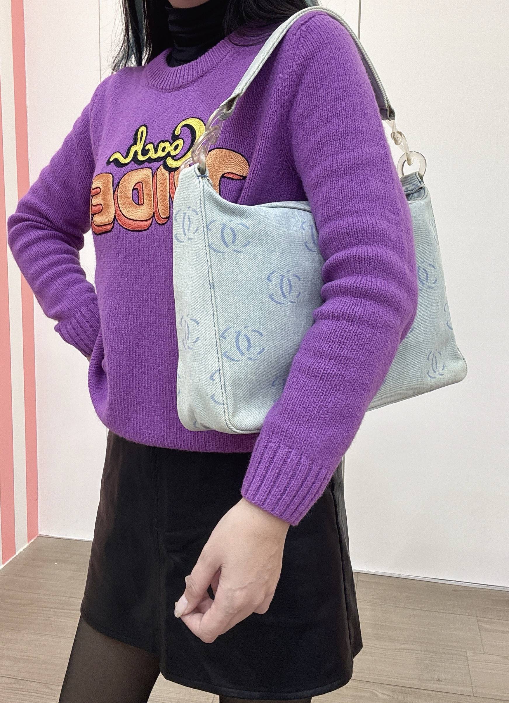 淺藍牛仔壓克力腋下包,水洗丹寧材質+滿印雙CLogo,低調又時髦計。透明壓克力鏈條和拉鍊頭,輕盈又有設計感