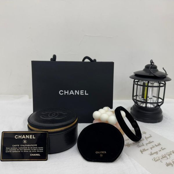 𝐂𝐡𝐚𝐧𝐞𝐥黑色圓形收納盒,採用優質皮革,搭配金色拉鍊和雙C標誌,簡約又超有辨識度十。內部空間適中,能收納化妝品、首飾等小物件,日常用或送禮都很合適(。附帶保卡,正品身份get!實用又時髦,𝐂𝐡𝐚𝐧𝐞𝐥粉絲必入!