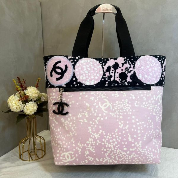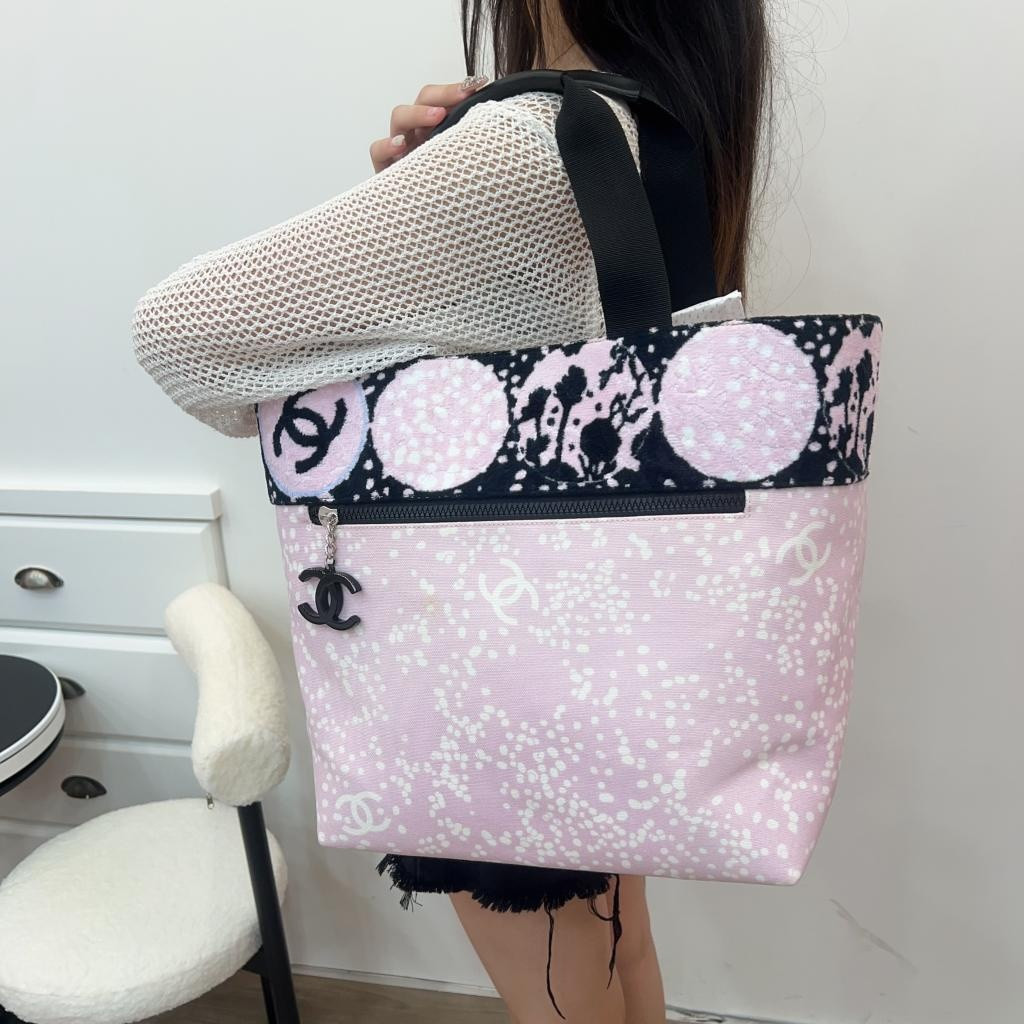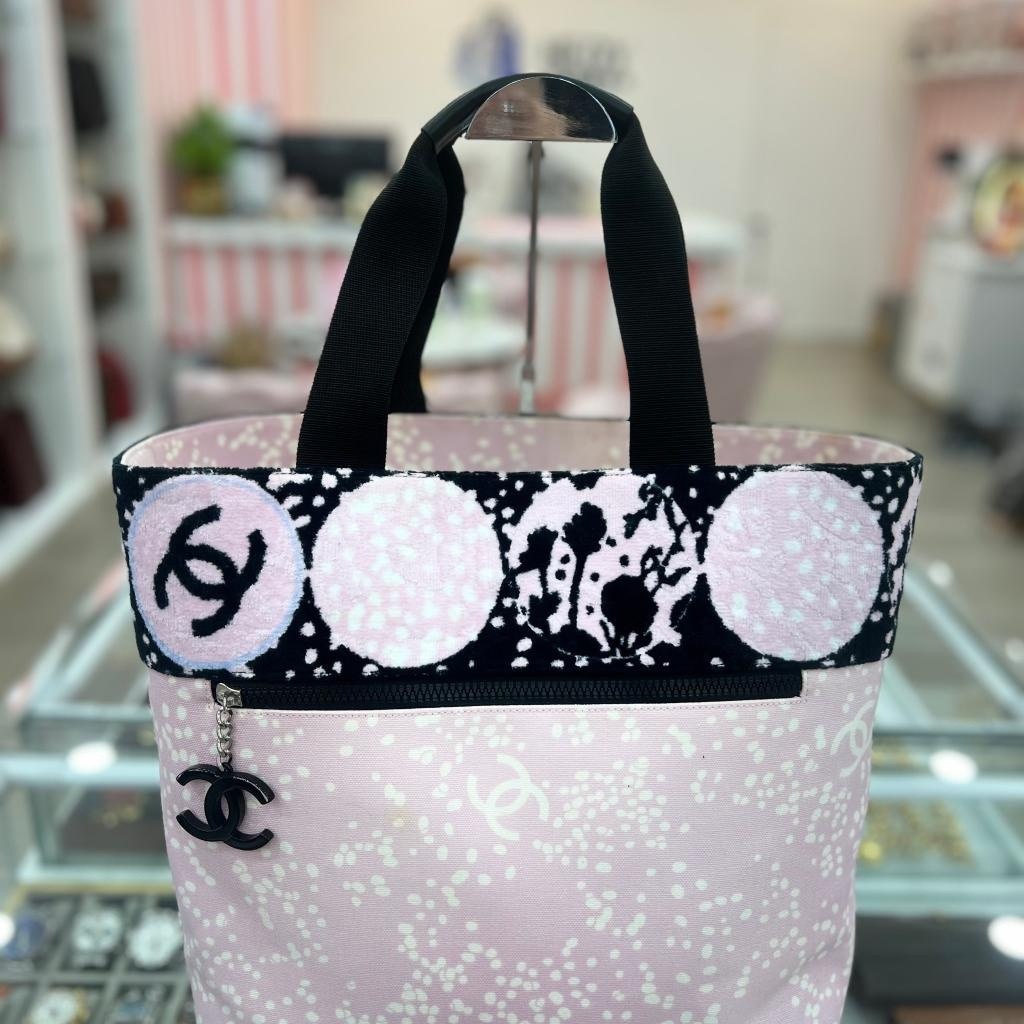 這款香奈兒帆布托特包融合了品牌經典元素與俏皮藝術風格,主體採用粉紅色帆布材質,點綴 Chanel 經典雙C logo 與不規則點點圖案,呈現輕盈又不失優雅的春夏氛圍。出自 2006 春夏限量系列,稀有收藏款。上緣的黑白粉抽象圓形印花與大膽撞色設計,展現 Chanel 在 2000 年代中期對街頭藝術與時尚融合的創新精神。搭配黑色雙C吊飾與粗織提把,不僅實用,同時也為整體造型增添亮點。