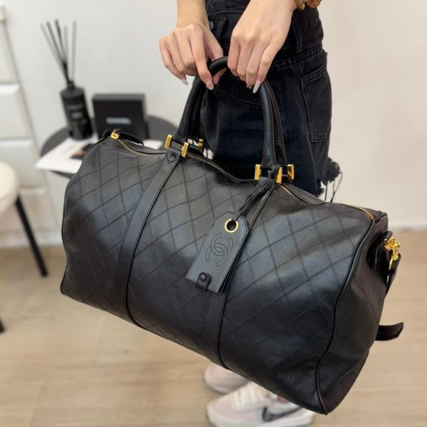 Chanel經典菱格紋旅行袋,採用柔軟黑色羊皮搭配金色五金,細膩的縫線工藝展現品牌標誌性風格。雙提把 + 可拆卸長肩帶設計,兼具手提與斜背功能。附有雙 C Logo 皮革吊牌,細節滿分。大容量設計適合旅行或週末出行,是兼具實用性與收藏價值的復古精品。
