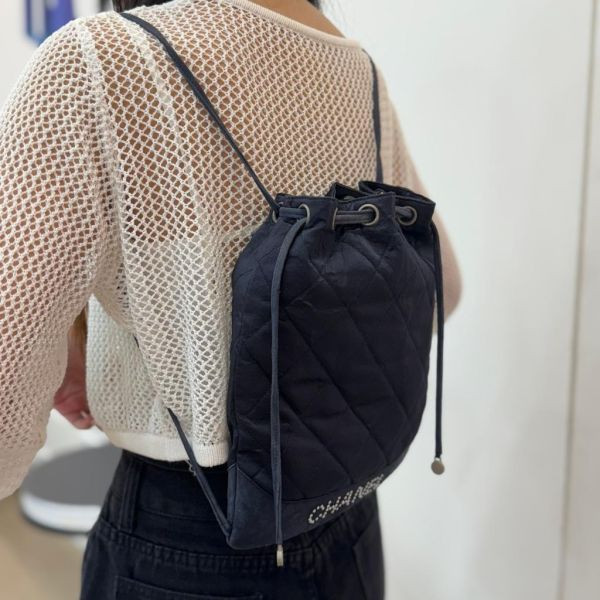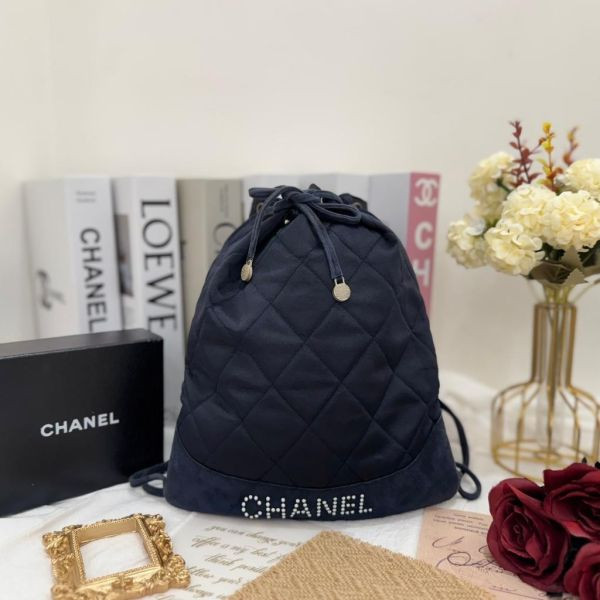 Chanel 絎縫束口後背包,以柔軟菱格布面搭配珍珠LOGO,演繹休閒中的優雅。輕盈大容量設計,陪妳自在穿梭日常。