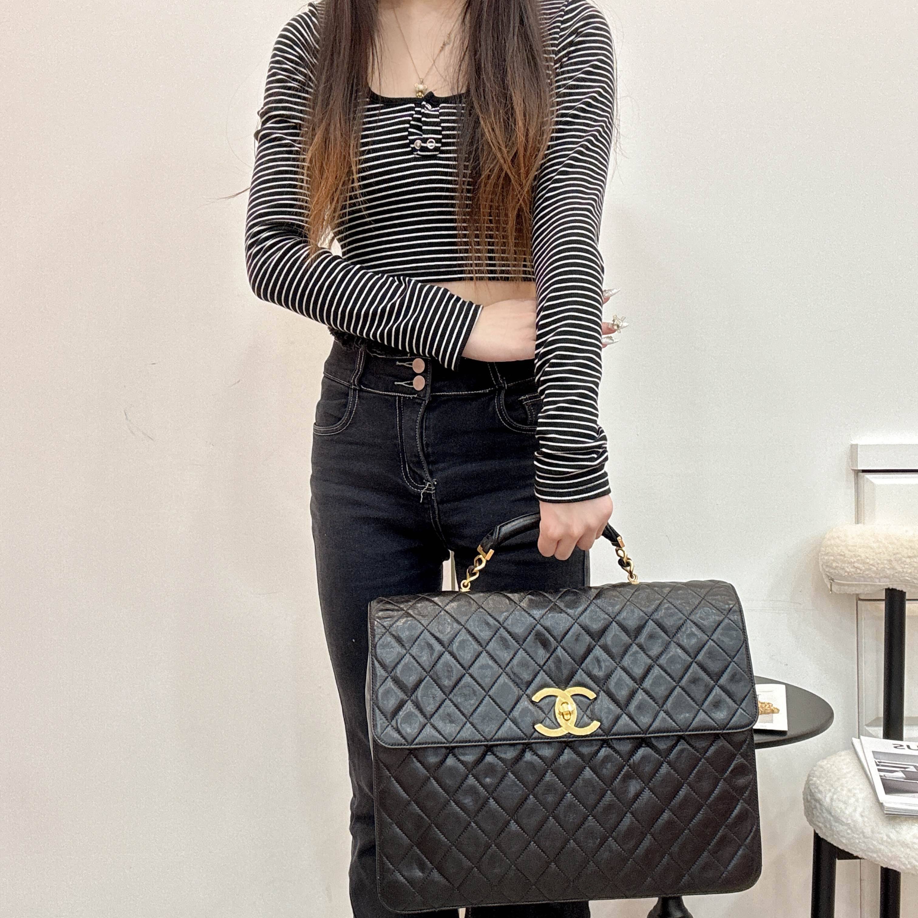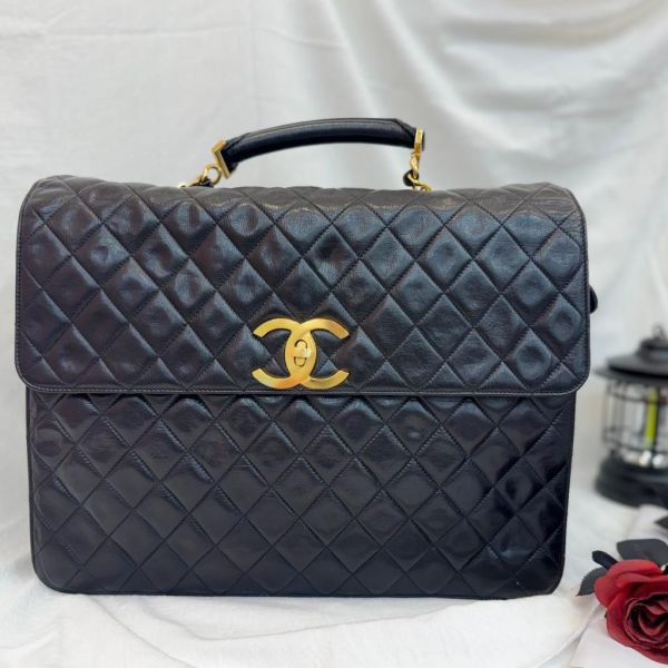 Chanel 90年代中古黑金公文包,荔枝紋牛皮+經典菱格紋,金色雙C標誌超有辨識度。容量大,通勤裝筆記本電腦毫無壓力!配有手柄和可拆卸肩帶,手提斜挎都OK,職場精英&復古控必入!