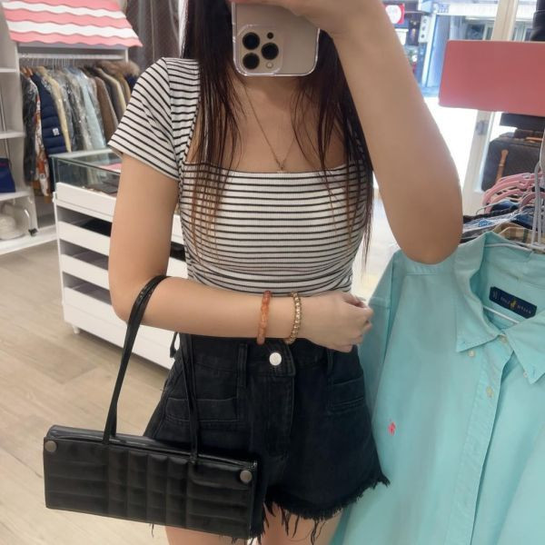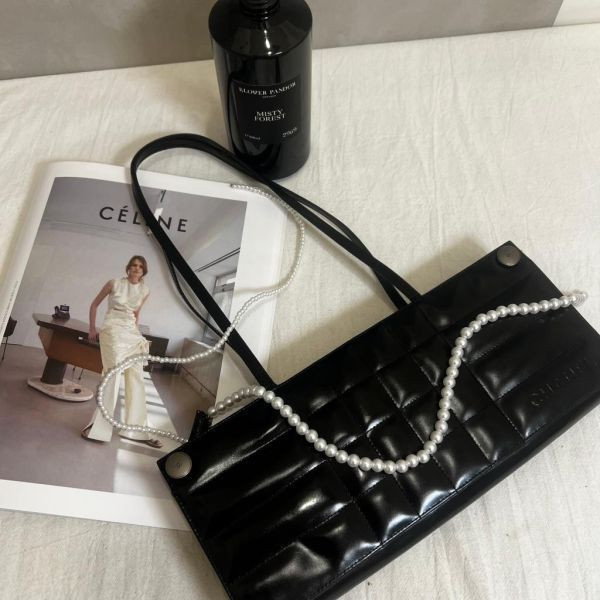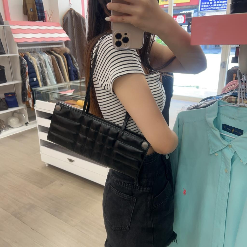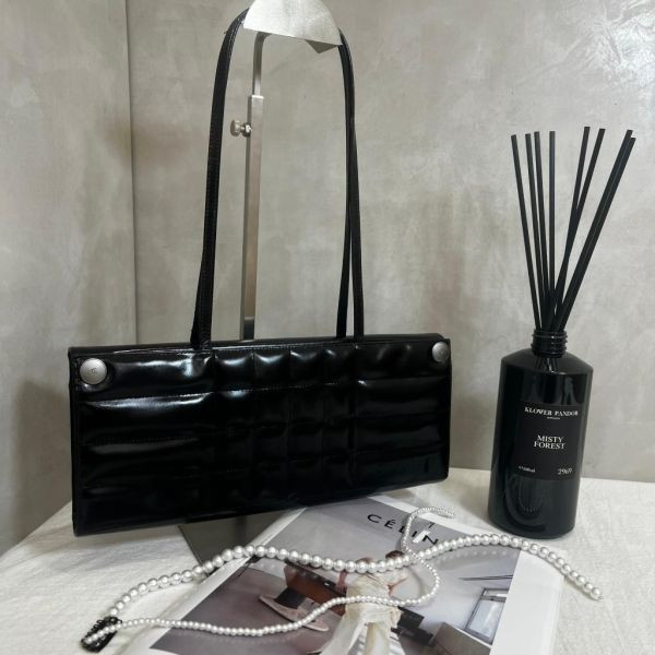 這款以黑色亮面小牛皮搭配立體壓紋設計,展現俐落現代感。包身修長獨特,點綴兩顆銀色金屬釦,低調卻充滿品牌辨識度。輕盈細肩帶設計,能優雅掛肩或隨性手提,適合日夜多場合搭配。