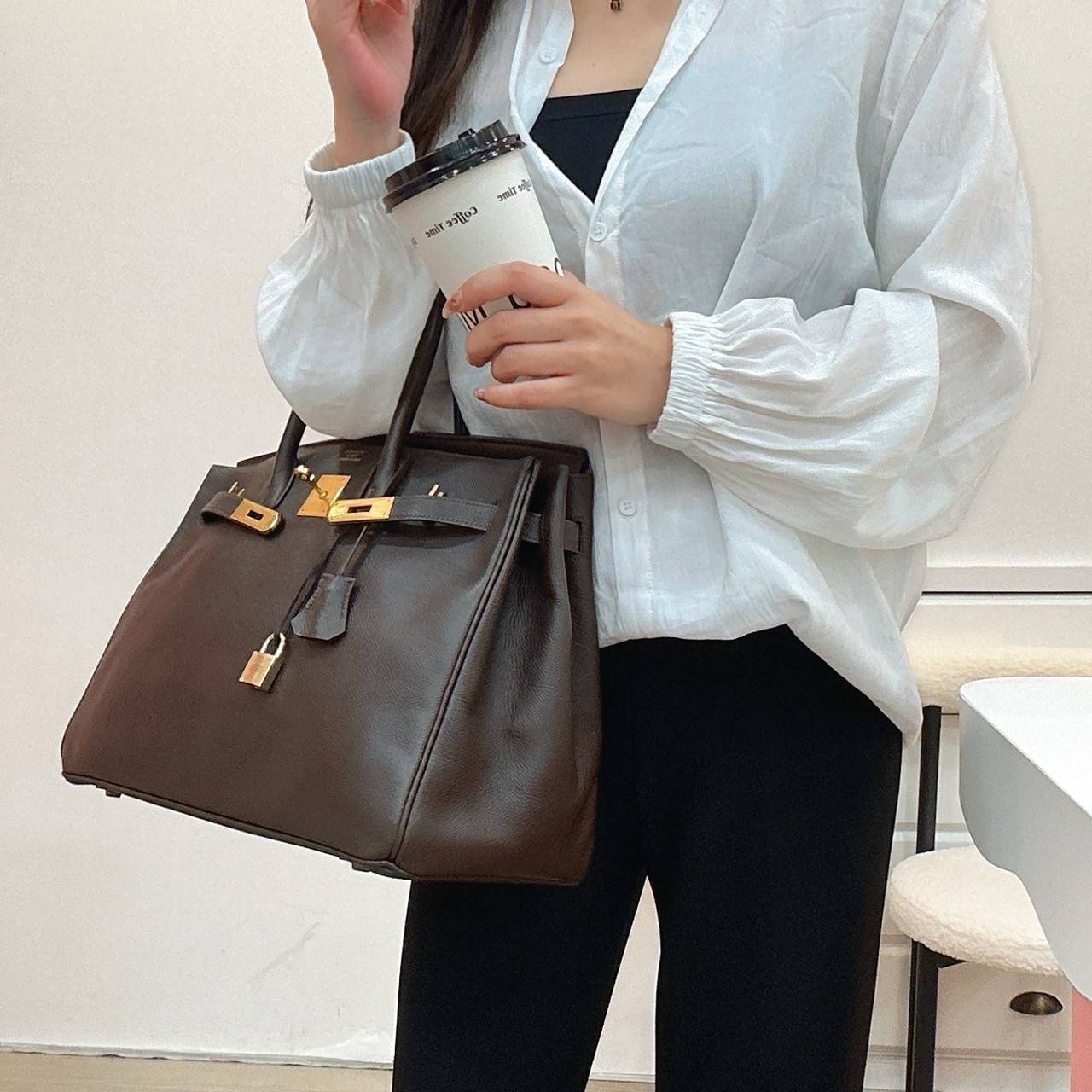 - 這款Birkin 35手袋採用深巧克力色Togo皮,搭配黑金五金,簡約又奢華✨。 Togo皮耐磨有質感,越用越有包漿,黑金配色低調高級,適合通勤或正式場合。 35cm容量剛好,日常物品輕鬆收納,手柄可手提或肩背,靈活百搭👜。 Birkin系列因稀有和保值屬性,成為奢侈品愛好者心頭好,二手市場行情也很堅挺哦!