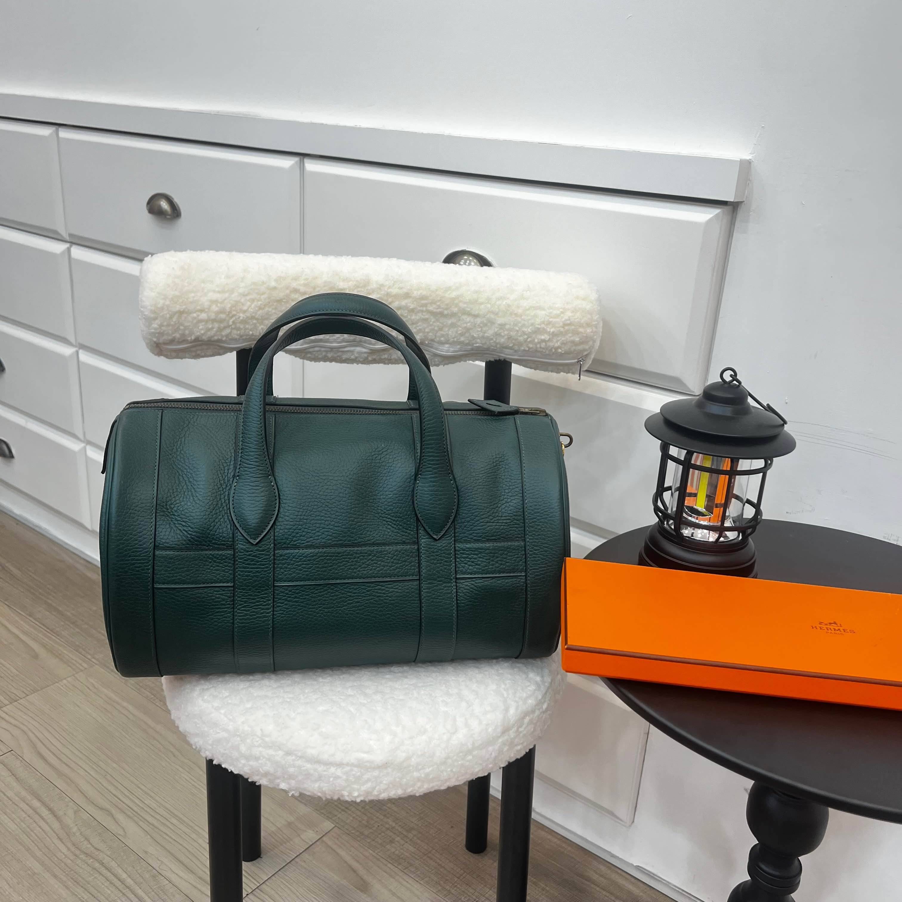 這款是 Hermès RD TRAVEL BAG 圓桶包,以沉穩深綠色小牛皮打造,結構挺立且具現代感的圓筒型設計,兼具旅行與日常的實用性。簡潔俐落的線條搭配極致皮革工藝,低調卻散發雋永的高級氣質,既可作為短途旅行包,也能是日常造型中的亮眼單品。