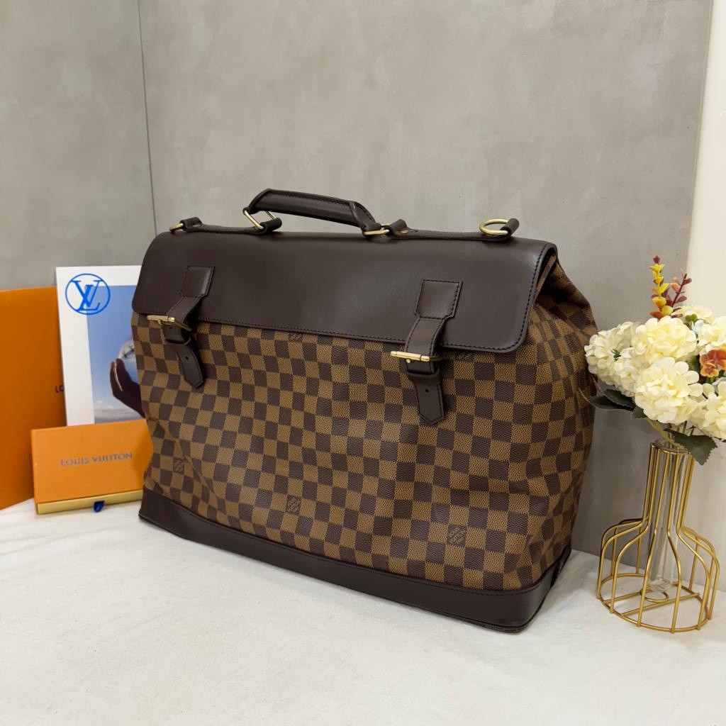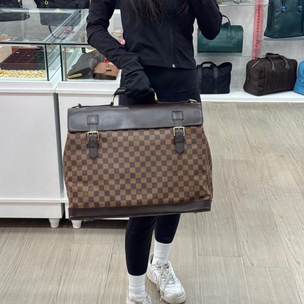 LV經典棋盤格狩獵包,採用Damier帆布+棕色牛皮飾邊,復古優雅氣質滿分。尺寸約44x34x19cm,容量大,通勤、旅行、商務都很適合!雙扣設計+內部隔層,收納方便,肩帶可拆卸,手提斜挎都OK人。棋盤格圖案低調百搭,男女都能輕鬆駕馭,是中古市場超受歡迎的稀有款!