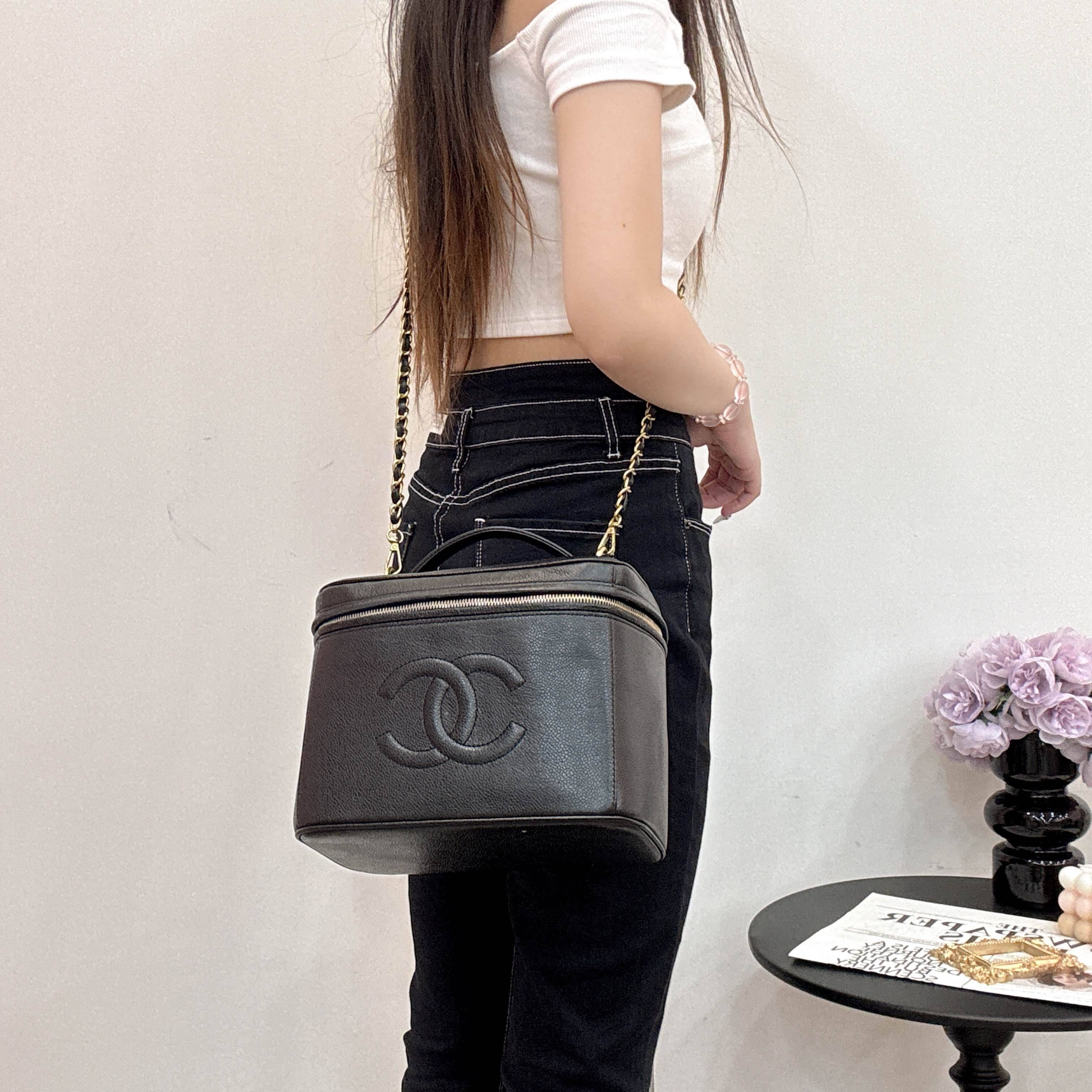 香奈兒中古化妝箱,黑色魚子醬牛皮+浮雕雙CLogo,質感超贊不易划傷!金色五金拉鍊和鎖扣,復古高級感滿滿。容量大,日常出行或旅行都能裝下化妝品和小物件。手提設計+頂部提手,DIY肩帶還能手拎、單肩或斜挎,實用又時髦山。中古市場超受歡迎,收藏價值高!