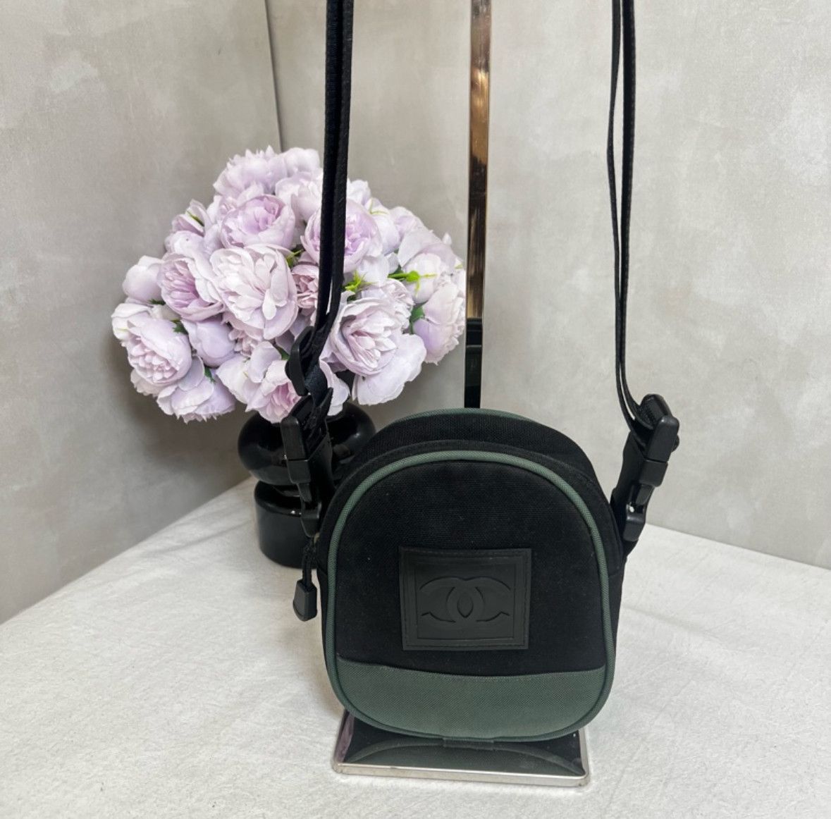 •這款香奈兒黑綠拼色運動斜挎包屬於經典SportLine系列,尼龍材質輕便耐用,日常出行超適合!圓形包型+黑色方形Logo,辦識度滿分;。肩帶可調節,男女都能背,容量剛好能裝手機、鑰匙等小物,實用又時髦。運動風設計,休閒穿搭必備,酷颯又有活力!