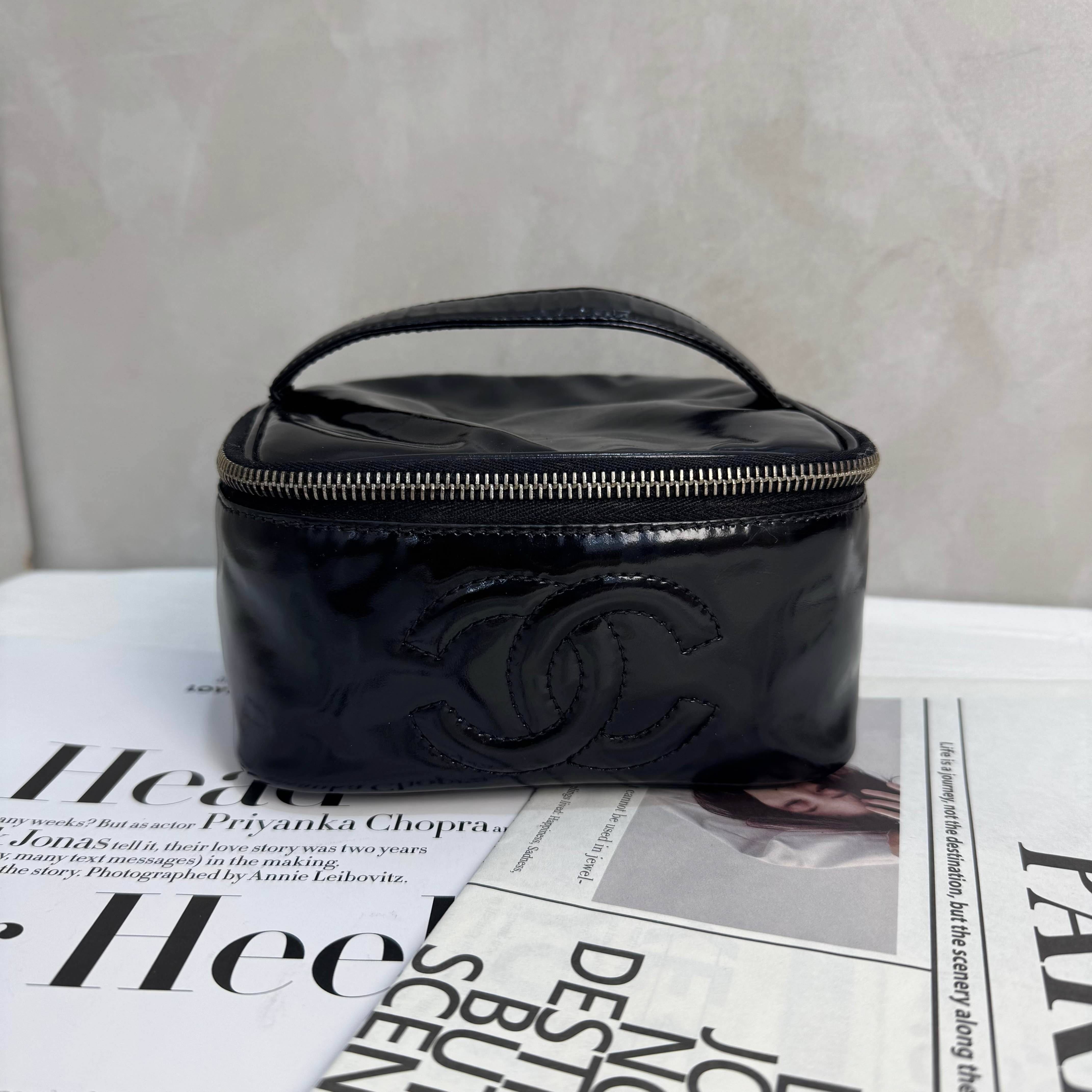 香奈兒中古漆皮化妝包,經典黑色漆皮+立體雙Clogo,金色拉鍊超有辨識度。尺寸約15-17cm,內部羊皮襯里,收納化妝品或小物超方便。很多中古款自帶鏡子,實用又有收藏價值!漆皮易清潔,但要注意避免划傷和高溫哦~日常搭配或收藏都很適合,時髦精必入!