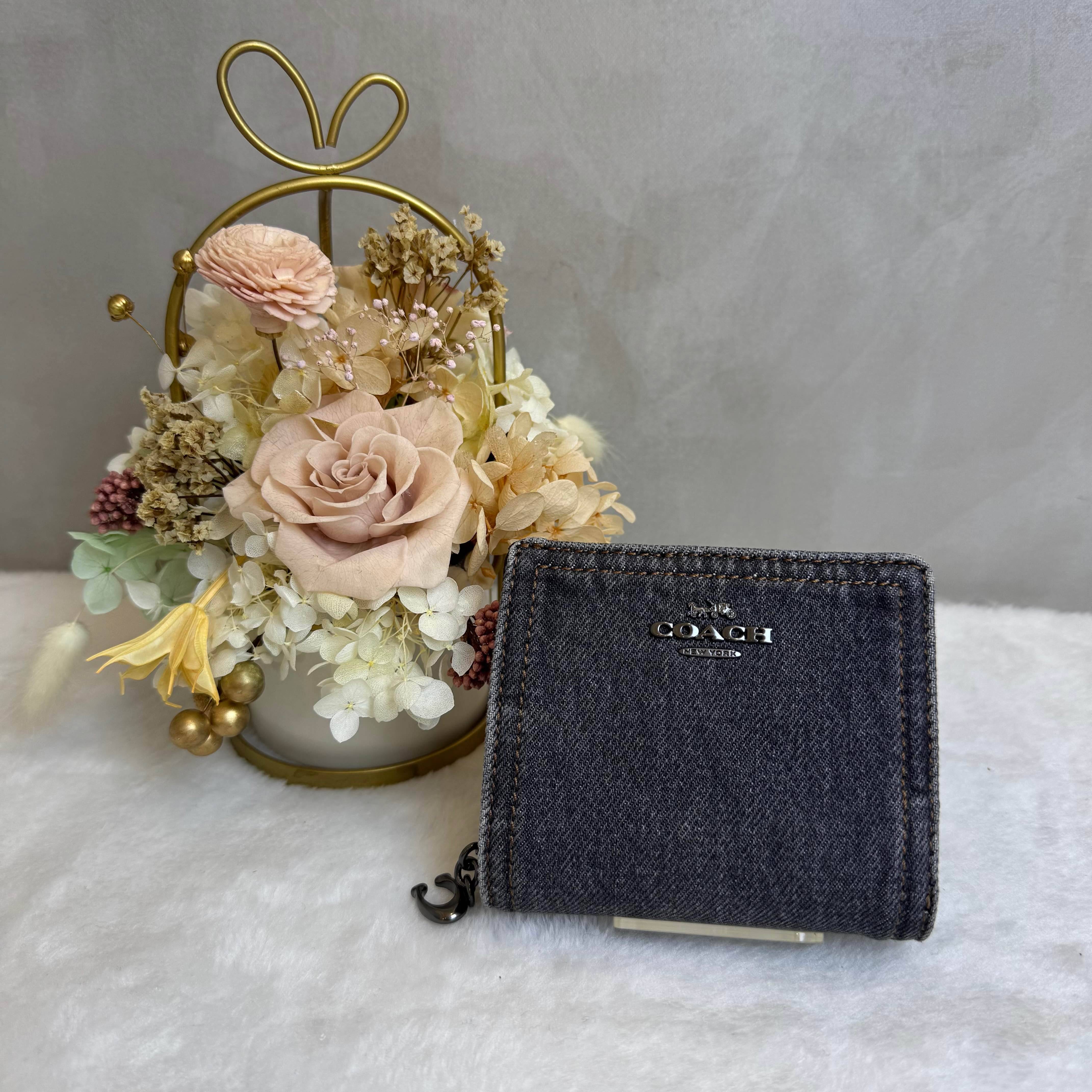 商品詳情 (全新商品)美國直寄 ·材質:牛仔·金屬顏色:黑銀色·尺寸:寬10.5x 高10x 深 2(公分)·產地:越南·產品狀況:全新商品。開放式零錢層。內裏有五卡層。·配件:盒子 Coach 牛仔藍短夾 TWD $3,580 TWD$ 3,580
