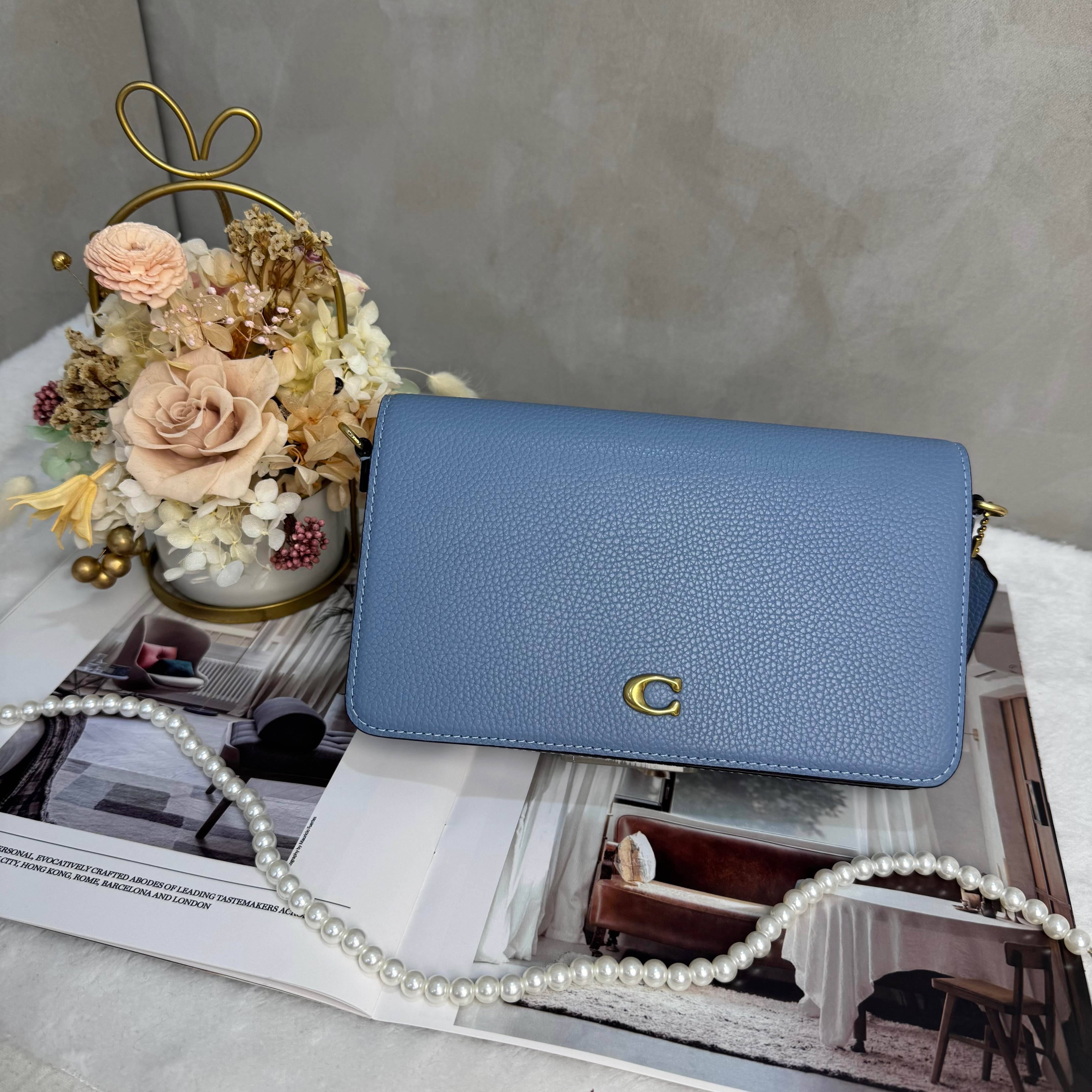 COACH Mila 斜背包,以柔軟的鵝卵石紋皮革打造,搭配經典C字旋釦,簡約而優雅。可拆卸肩帶設計,讓您自由變換風格,輕鬆駕馭各種場合。這款百搭的藍色包款,是您日常穿搭的最佳選擇。
