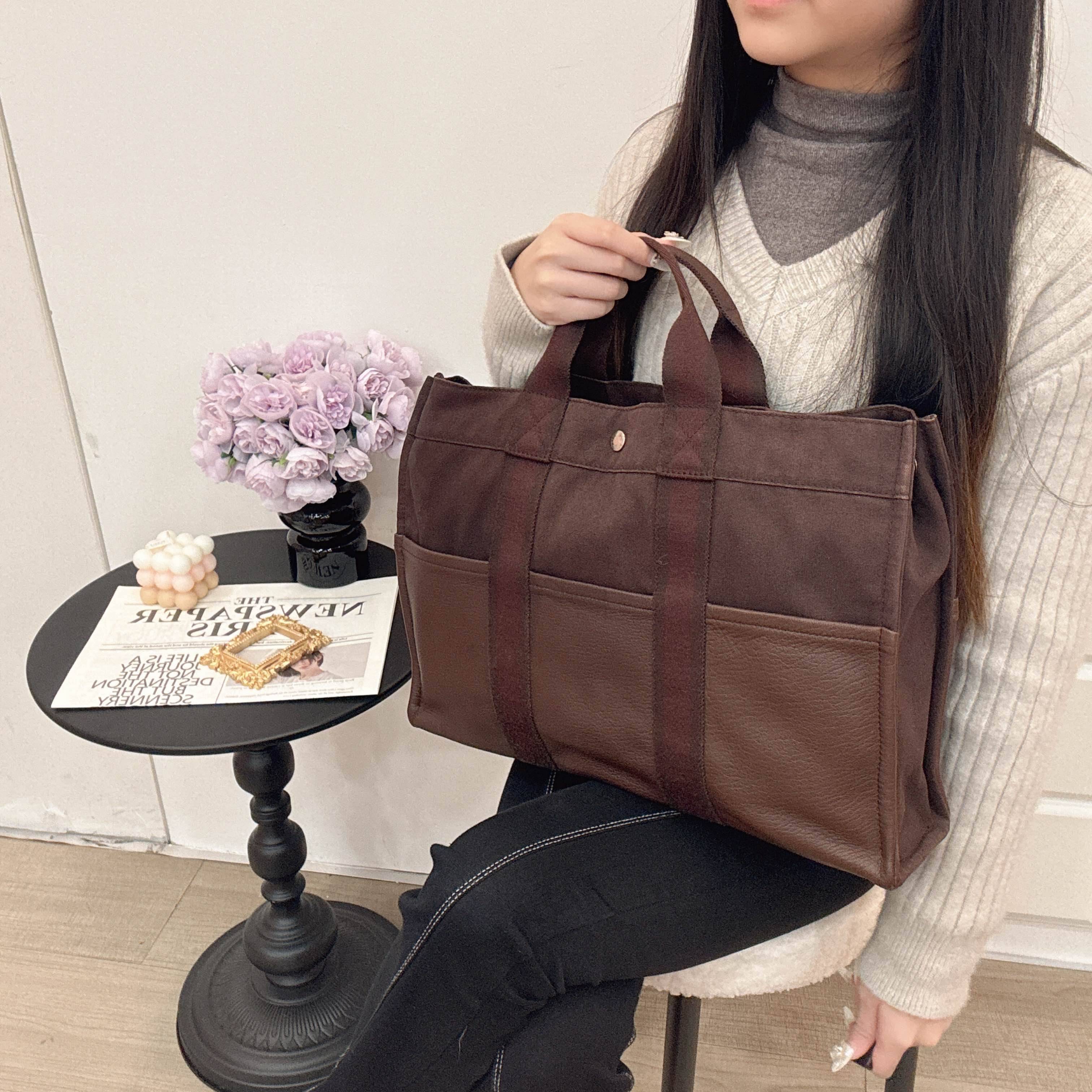 沉穩深咖帆布拼接細緻皮革,線條俐落耐看,低調卻極具質感。大容量設計,日常通勤、短途外出都能輕鬆收納所需,兼具實用與品味,是越用越好看的經典托特包。