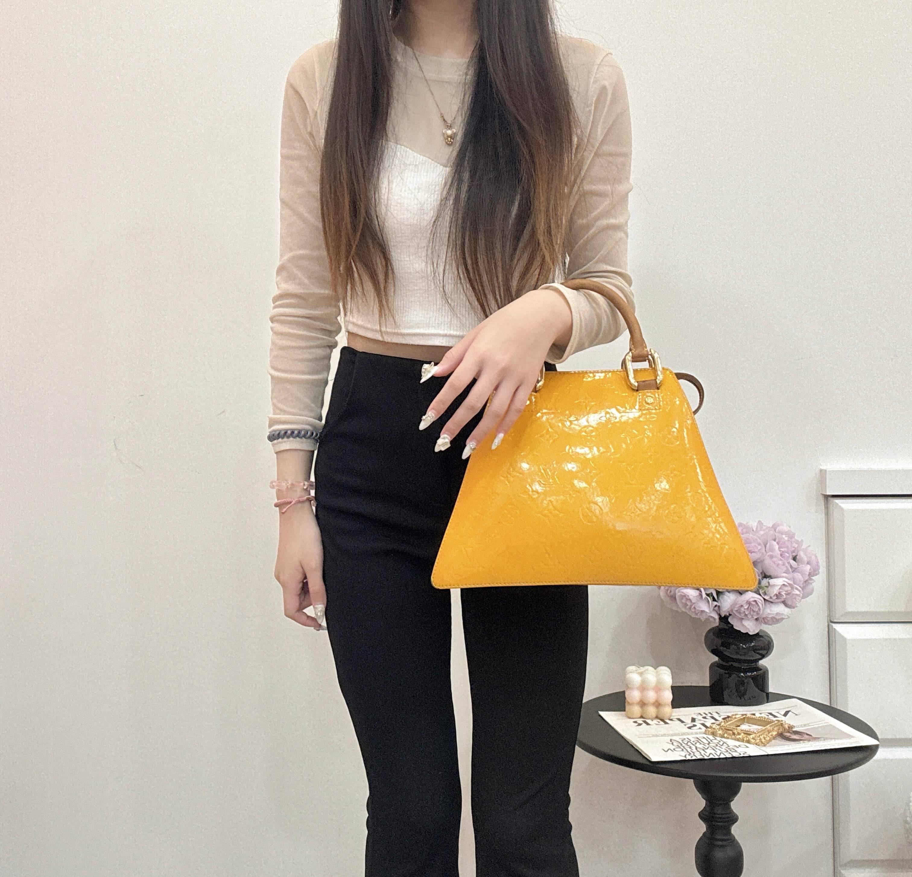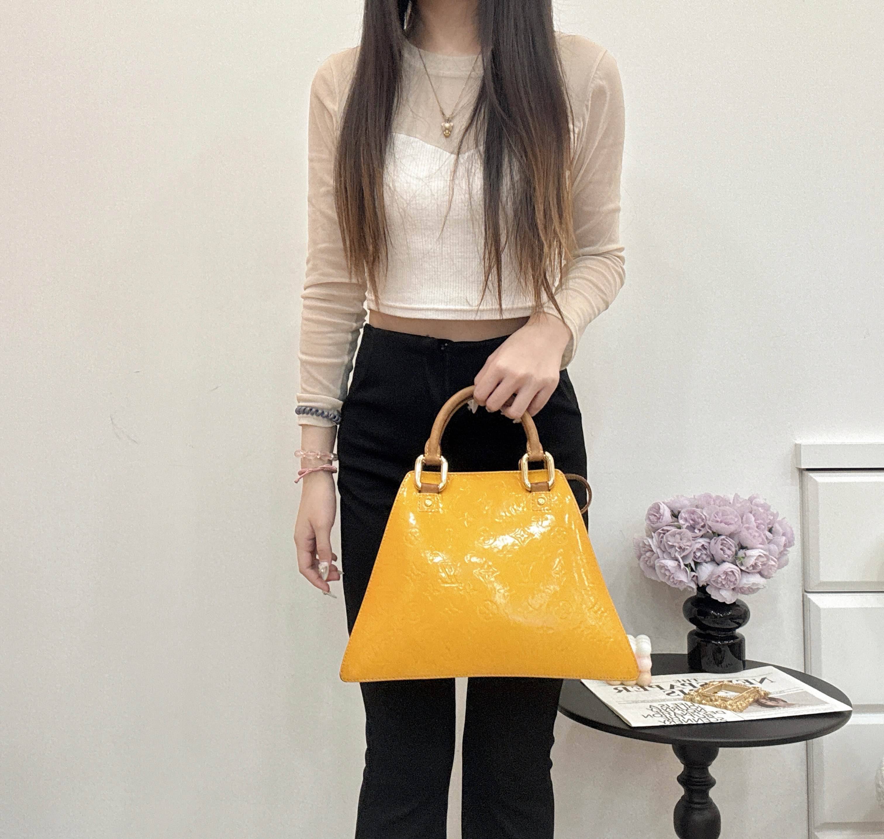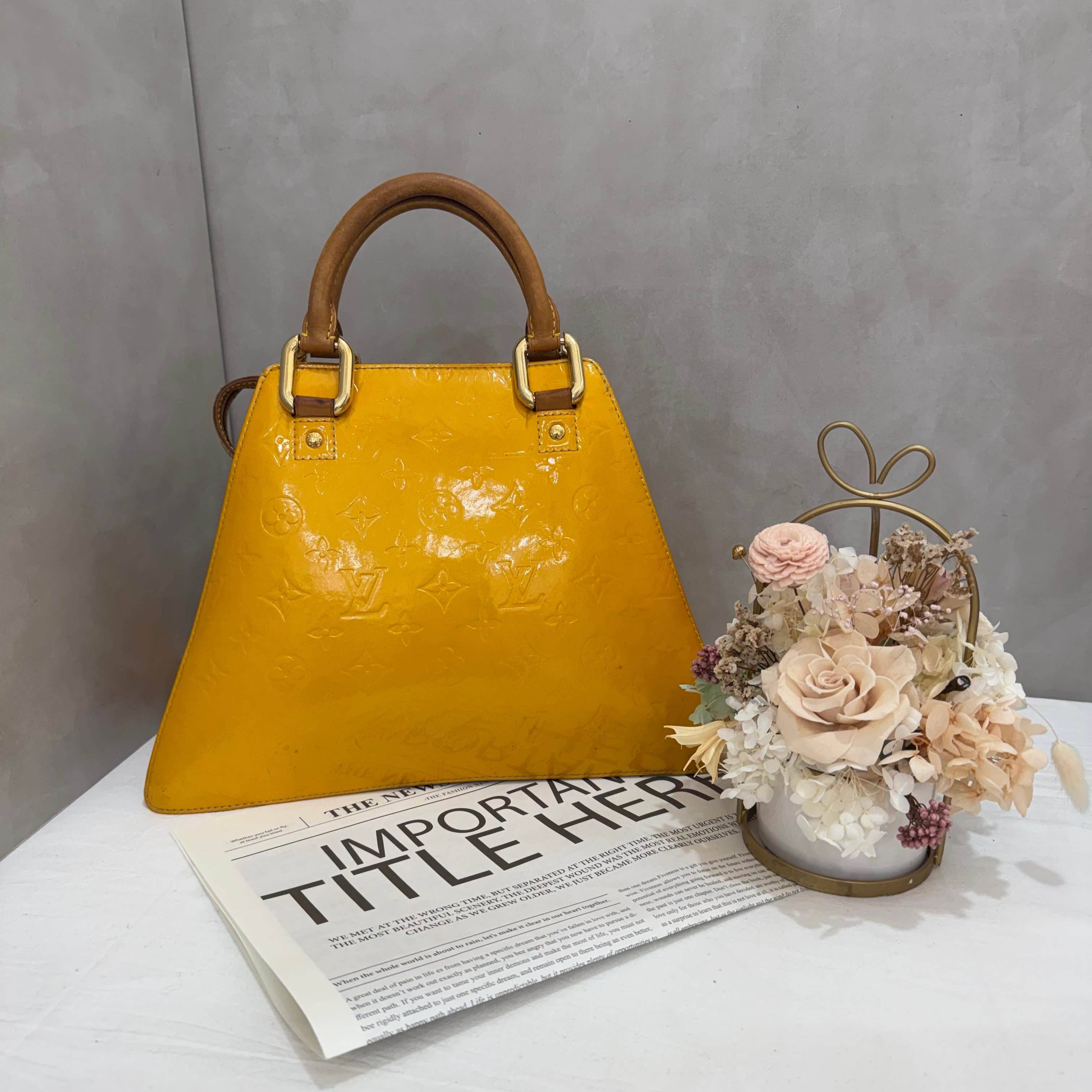 Monogram Vernis系列,亮黃色漆皮+經典老花壓紋,金屬扣件+植鞣革手柄,復古又摩登。梯形設計超有辨識度,容量適中,通勤出街都很OK!漆皮光澤感滿分~這款在中古市場超稀有,收藏價值高,喜歡獨特設計的姐妹別錯過!