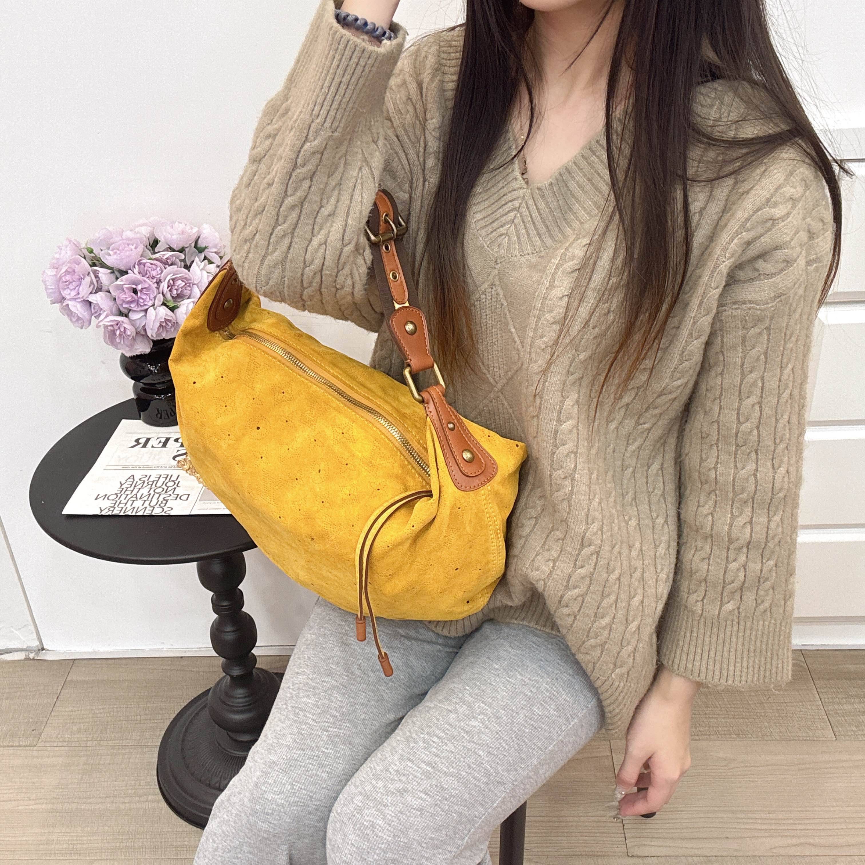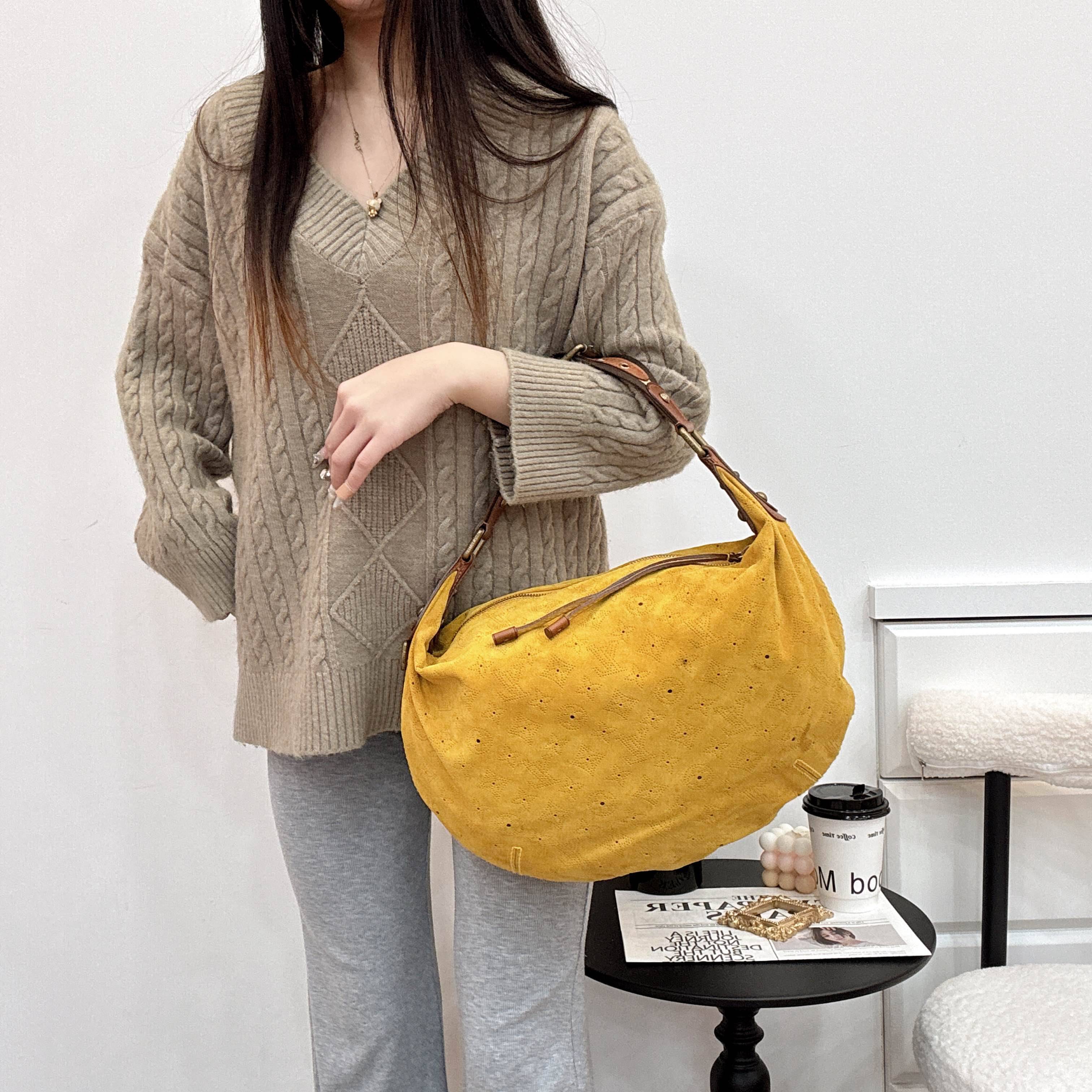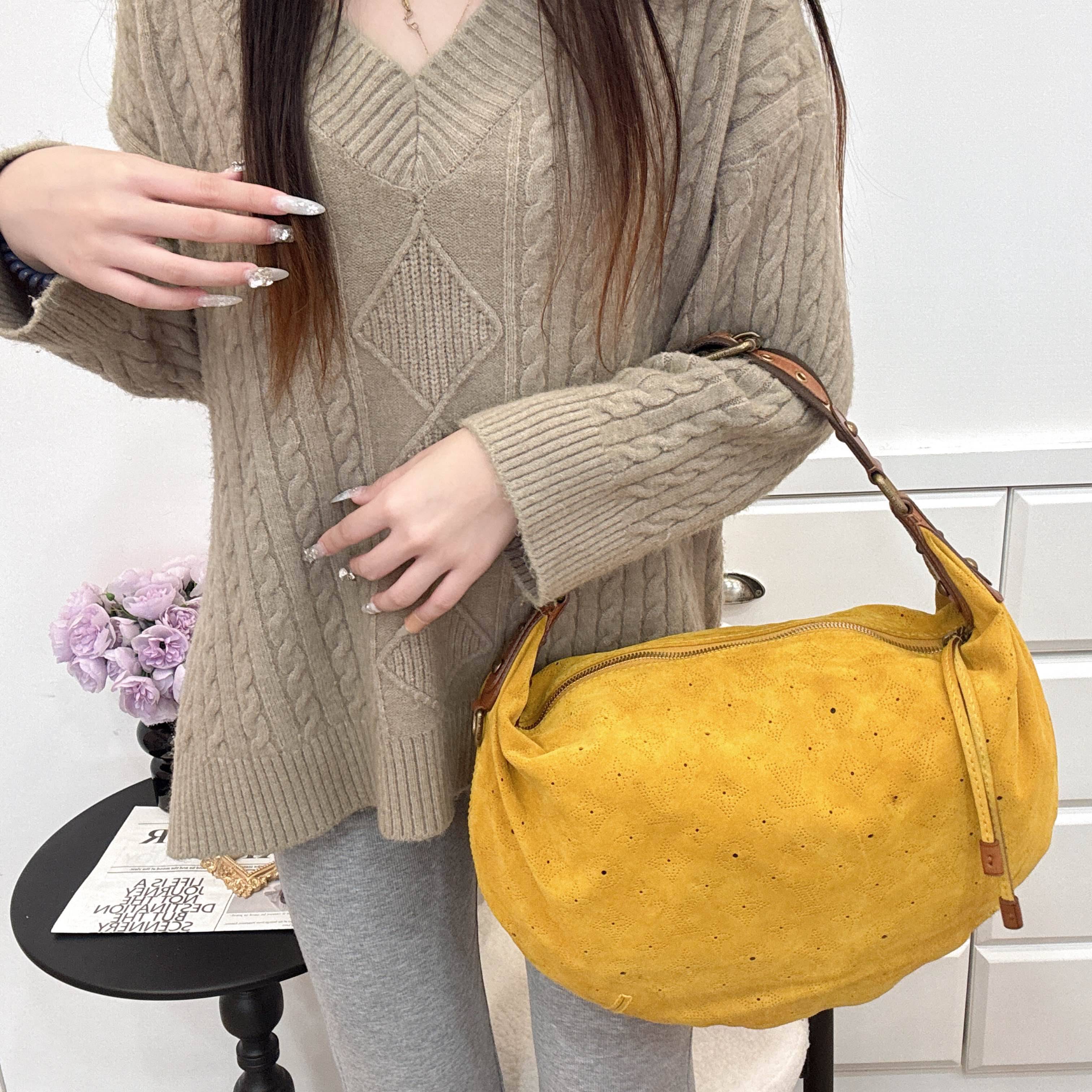 SLV中古麂皮腋下包,姜黃色麂皮+鏤空老花,復古又時髦!肩帶皮質+金屬鏈,長度可調,單肩/斜挎都OK。輕盈柔軟,日常出街超百搭。麂皮易沾污,記得定期清潔哦~限量款,收藏價值高,搭配深色或基礎色穿搭,輕鬆點亮造型!