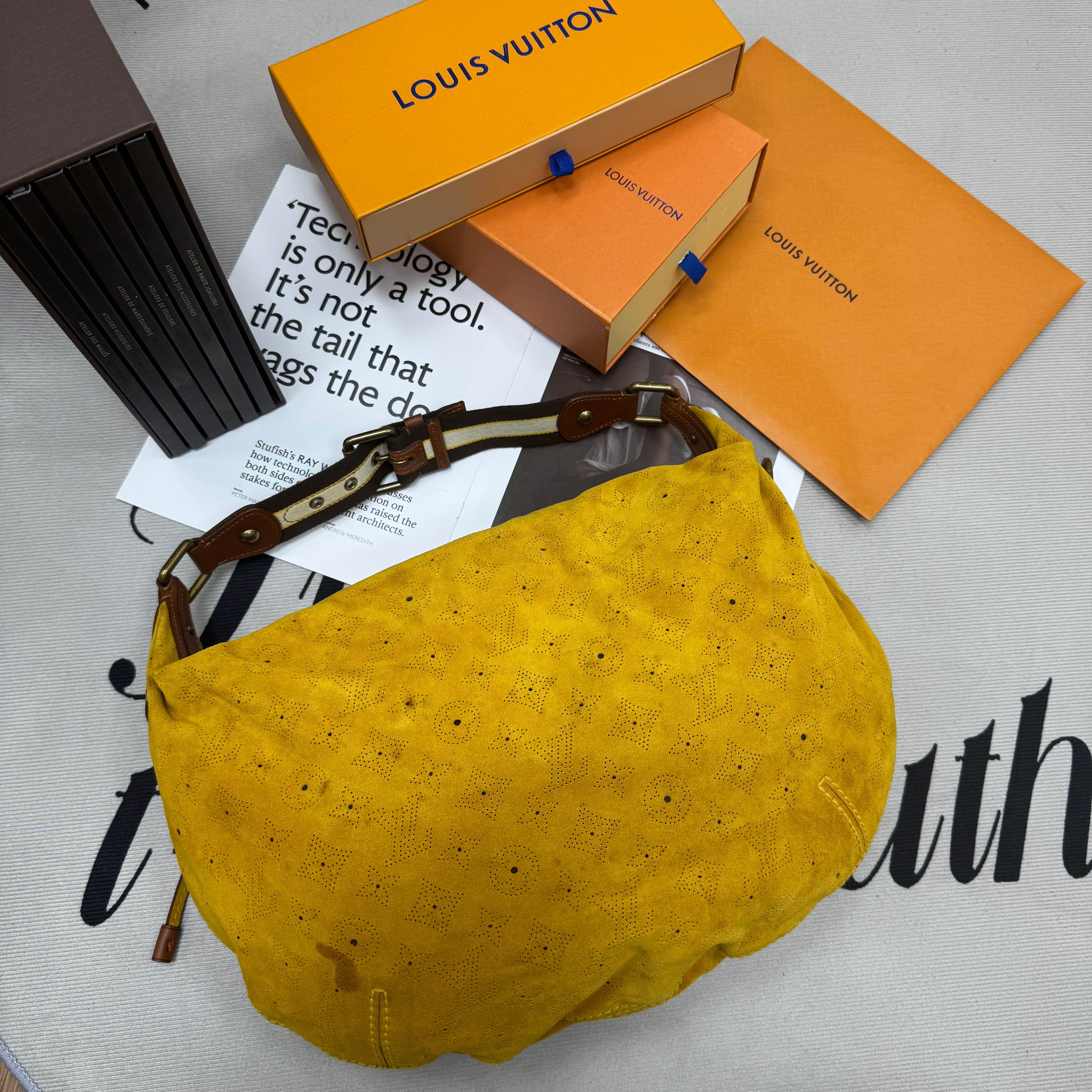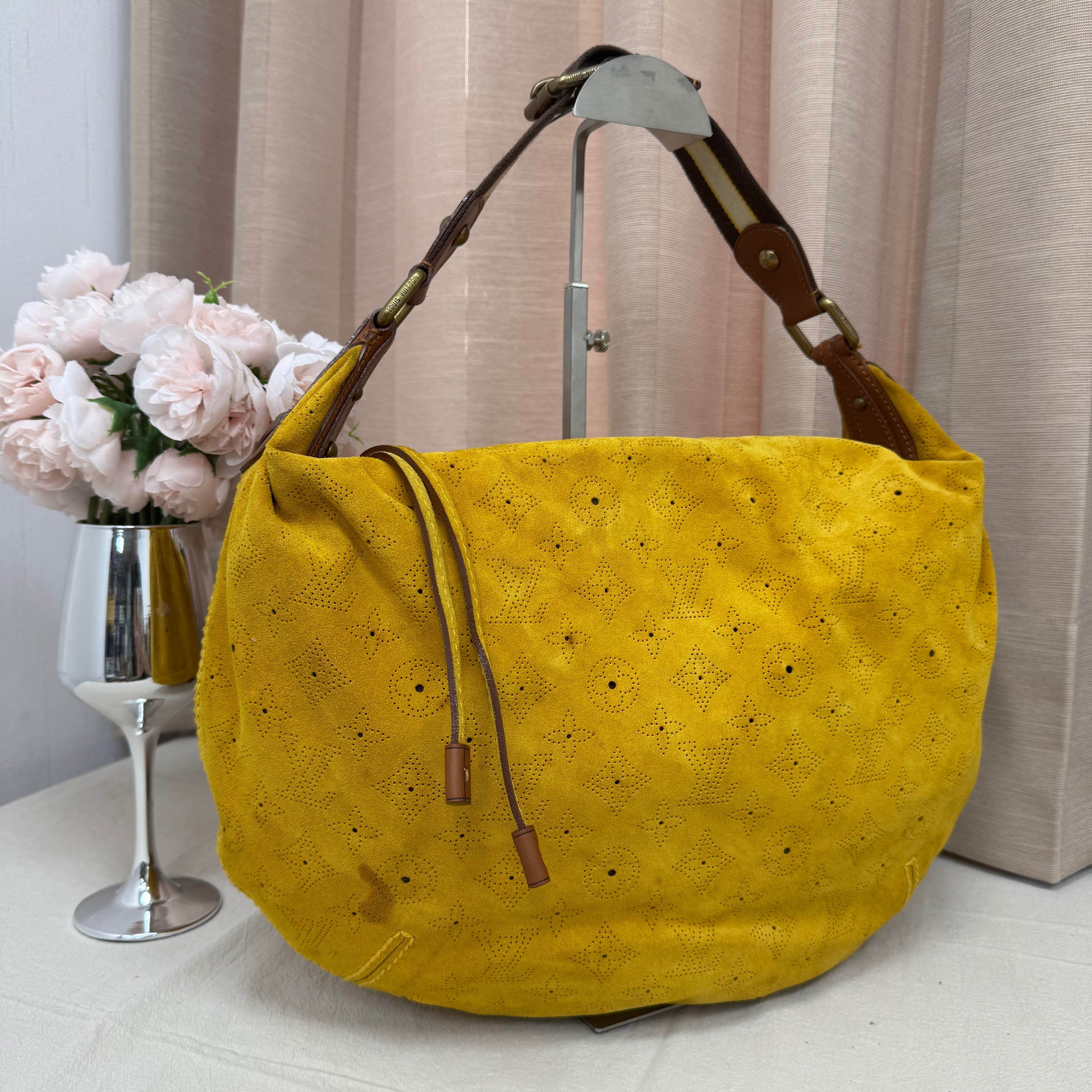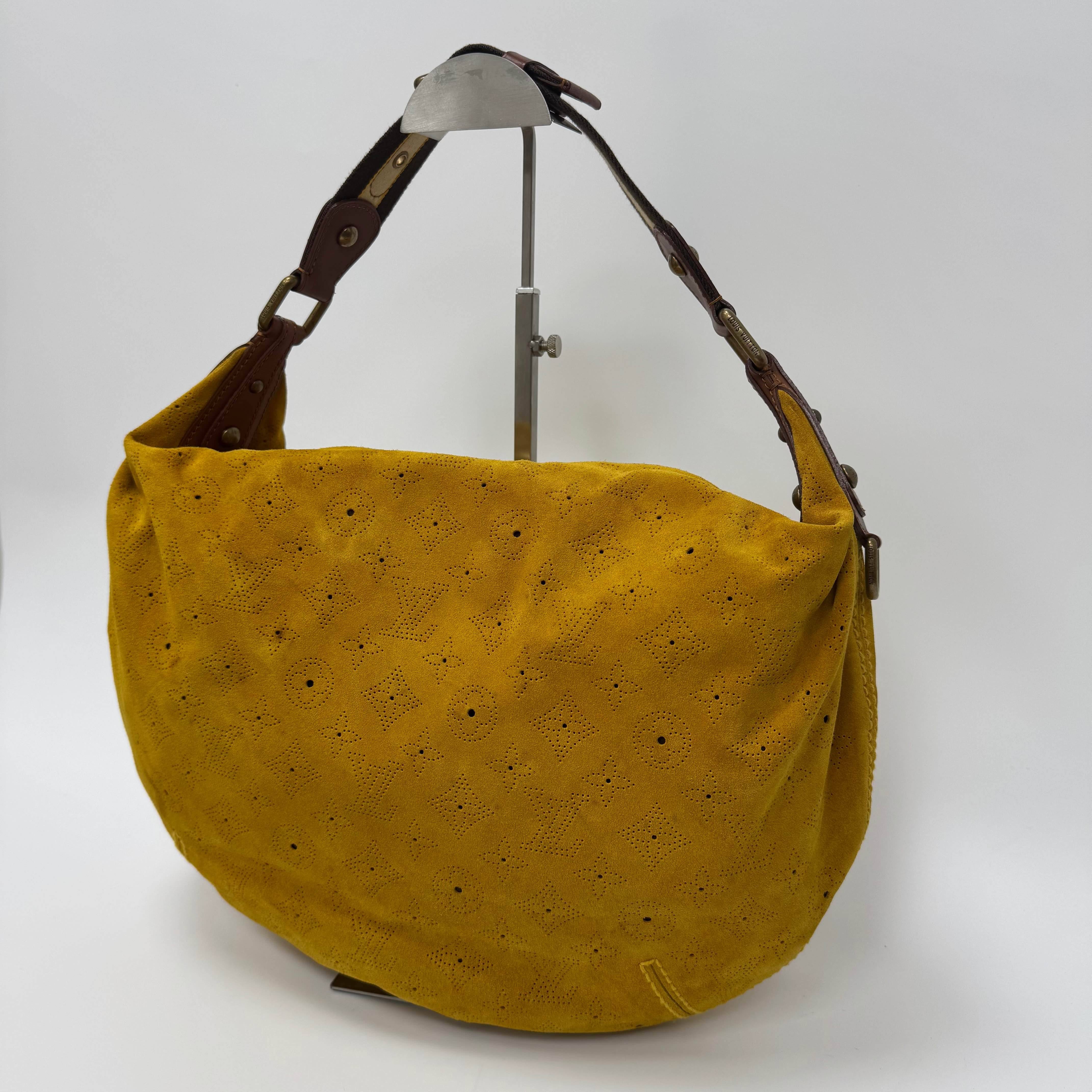 SLV中古麂皮腋下包,姜黃色麂皮+鏤空老花,復古又時髦!肩帶皮質+金屬鏈,長度可調,單肩/斜挎都OK。輕盈柔軟,日常出街超百搭。麂皮易沾污,記得定期清潔哦~限量款,收藏價值高,搭配深色或基礎色穿搭,輕鬆點亮造型!