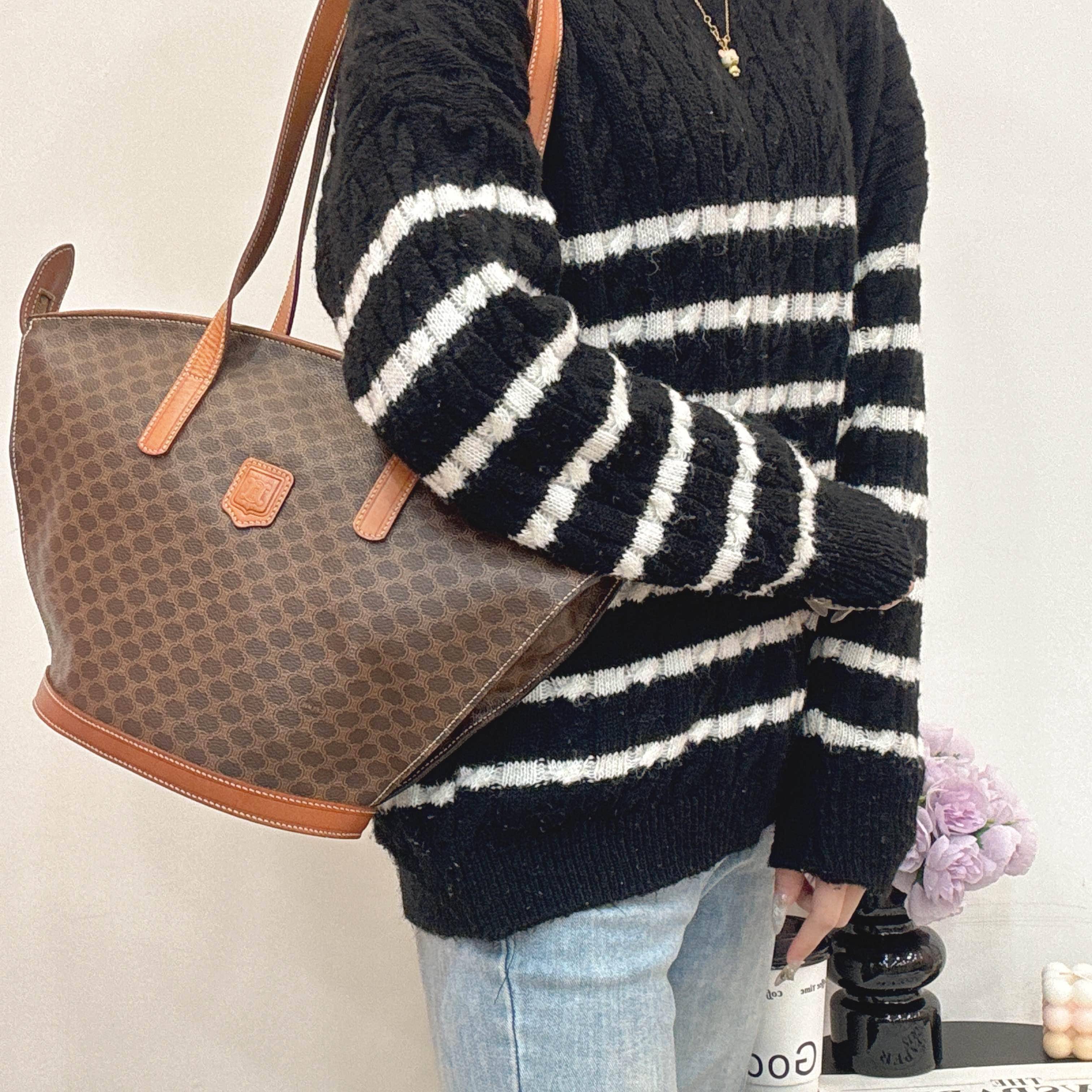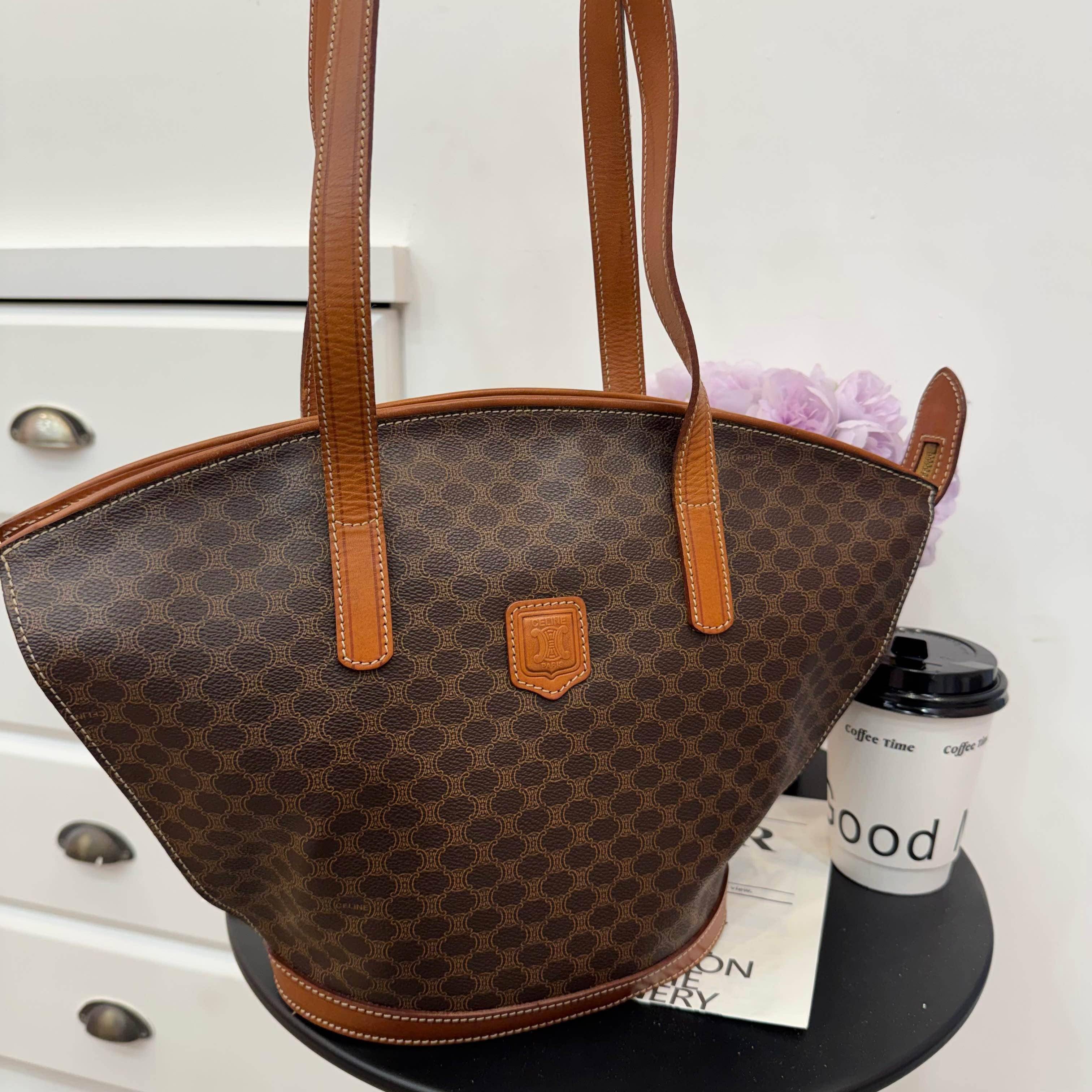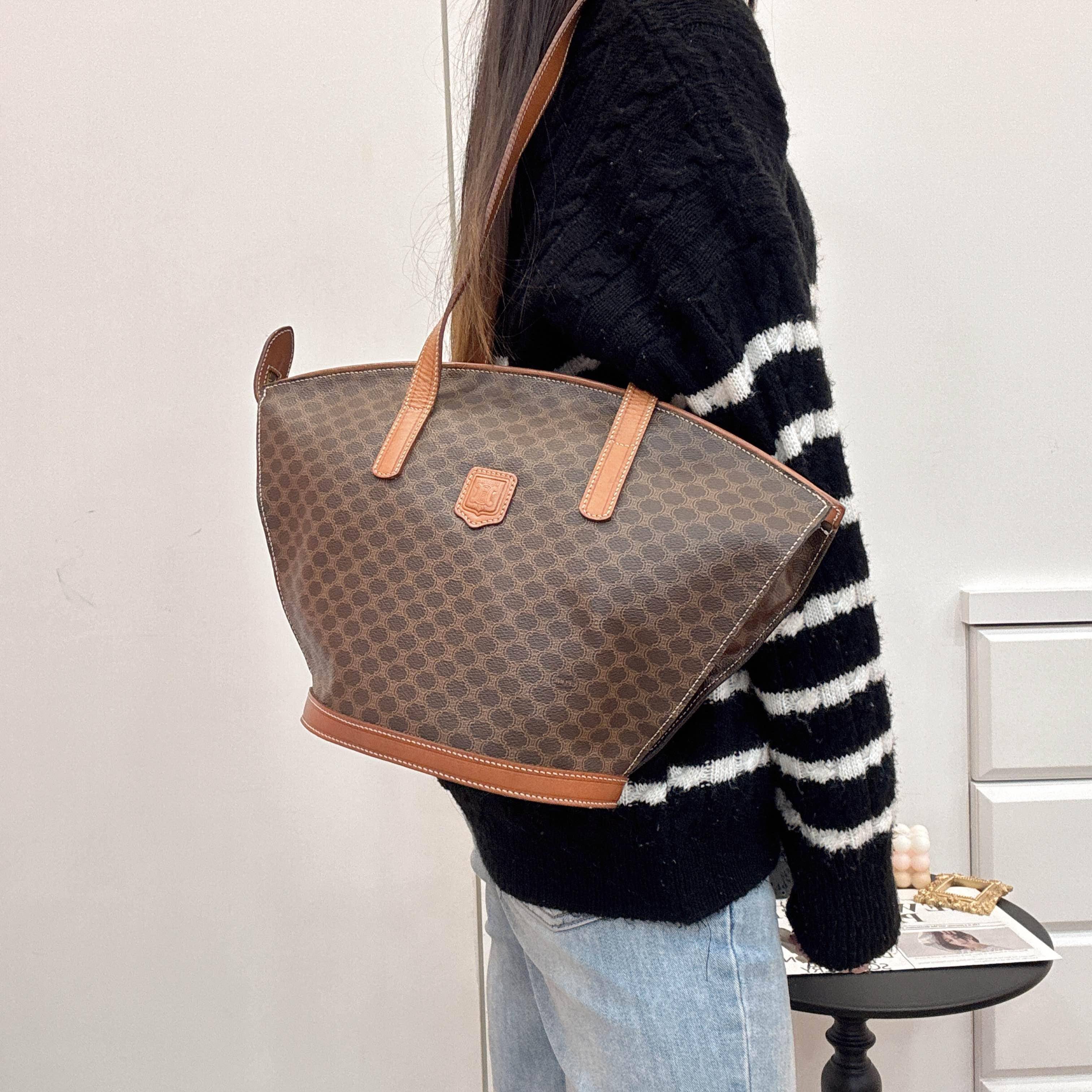 Celine中古貝殼托特包,經典Triomphe老花帆布+棕色皮革飾邊,低調復古超有質感。獨特貝殼造型,容量大又輕便,通勤出街都OK!肩帶長度剛好,手提肩背隨心切換。老花圖案辦識度高,不易撞款,實用又有收藏價值,是中古包愛好者的心頭好~
