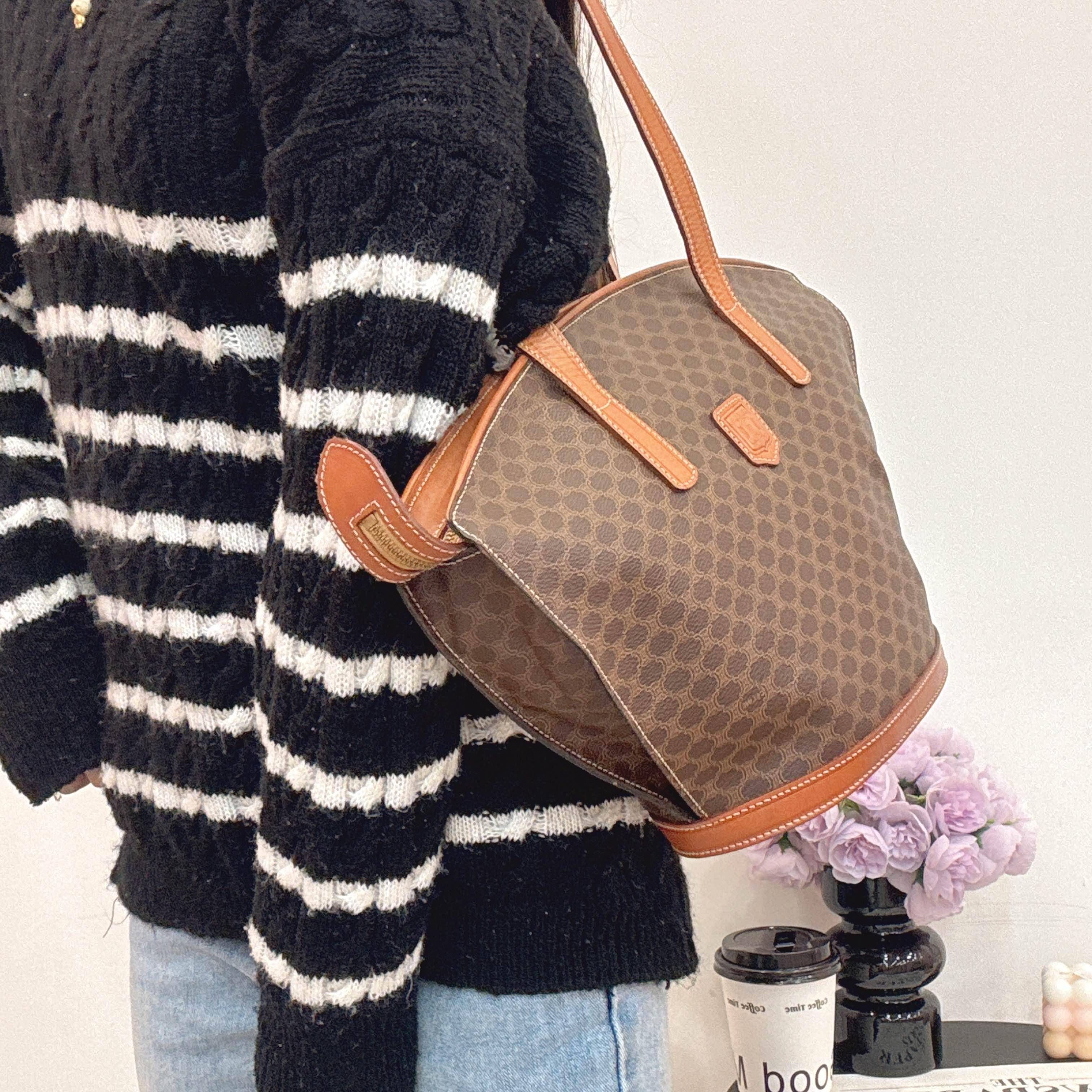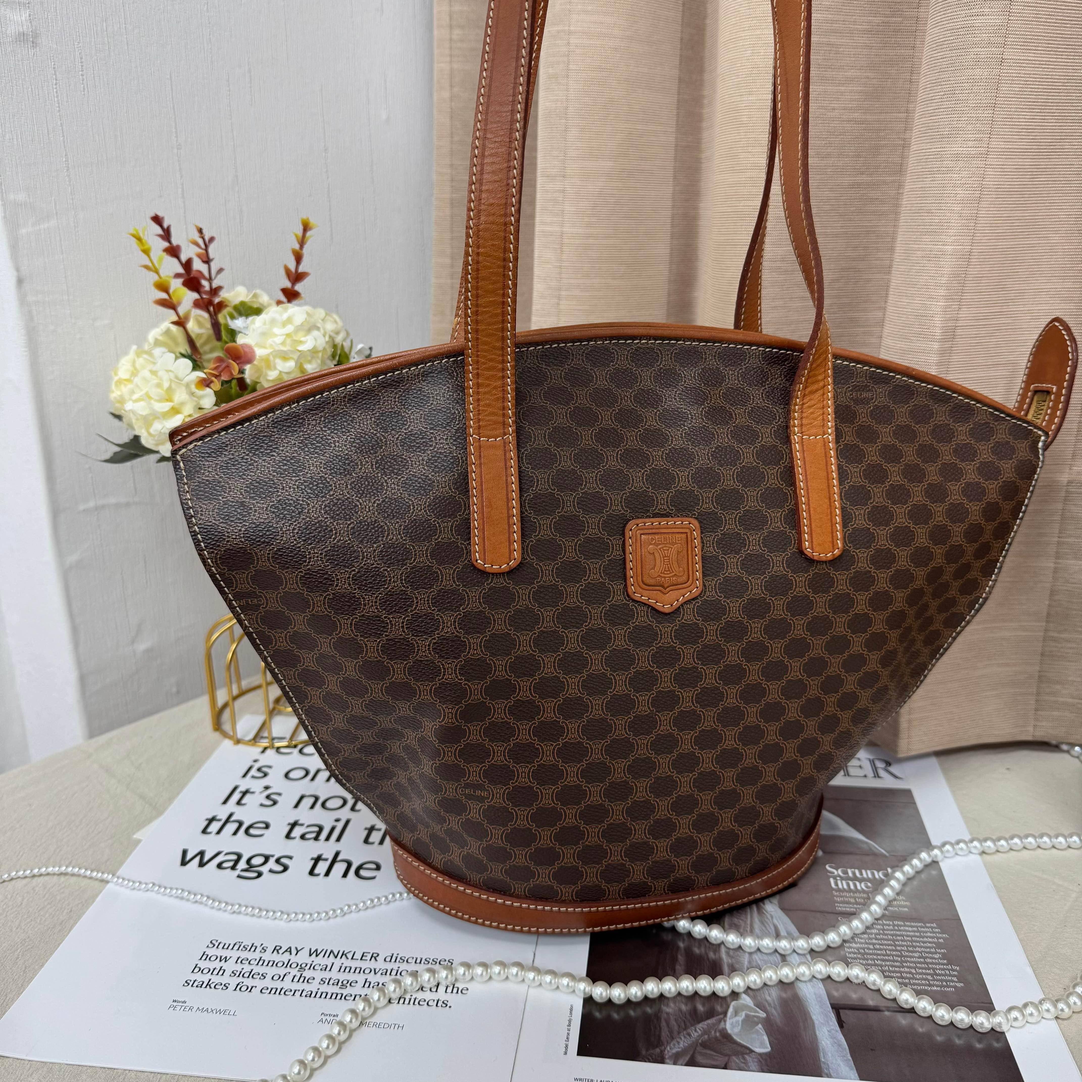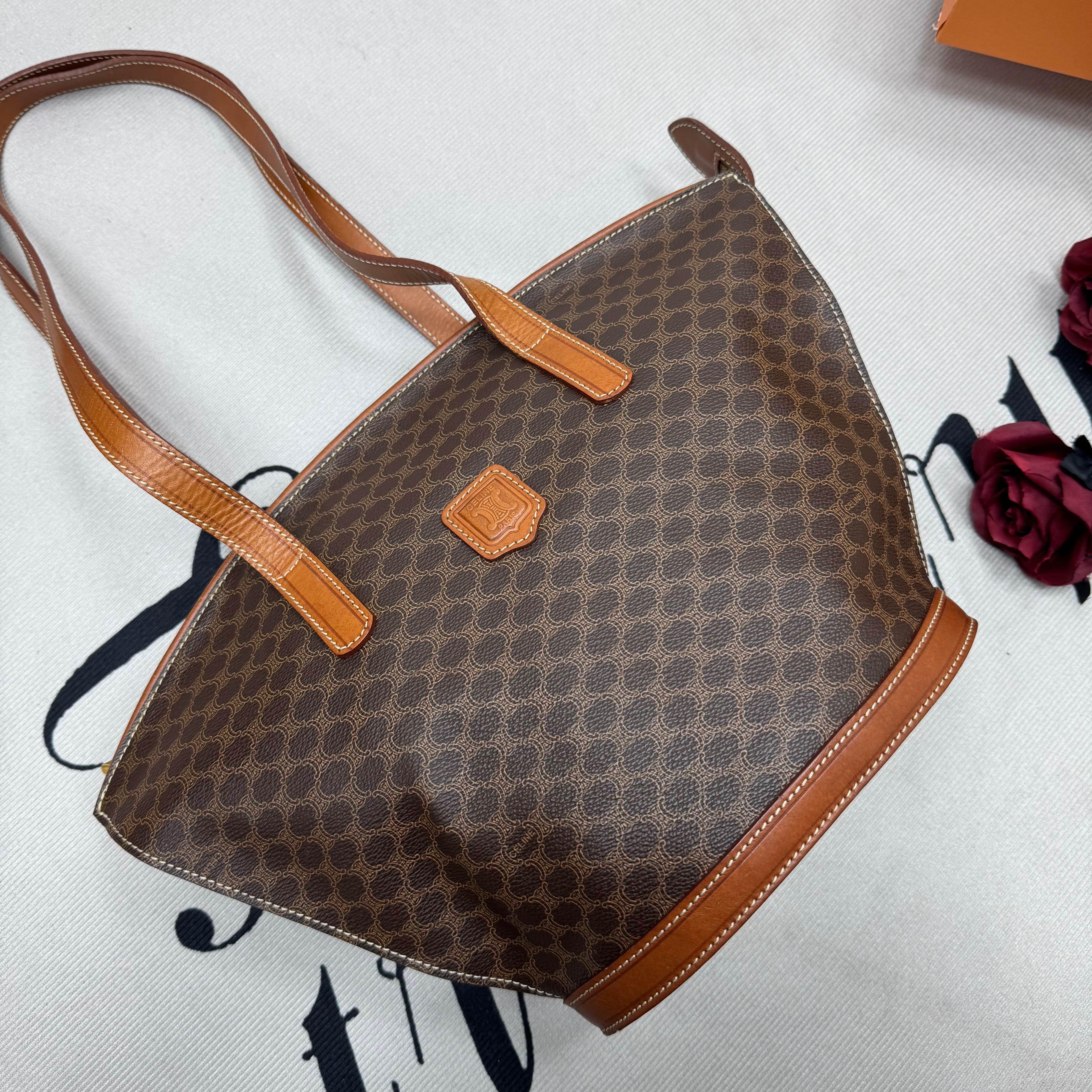 Celine中古貝殼托特包,經典Triomphe老花帆布+棕色皮革飾邊,低調復古超有質感。獨特貝殼造型,容量大又輕便,通勤出街都OK!肩帶長度剛好,手提肩背隨心切換。老花圖案辦識度高,不易撞款,實用又有收藏價值,是中古包愛好者的心頭好~