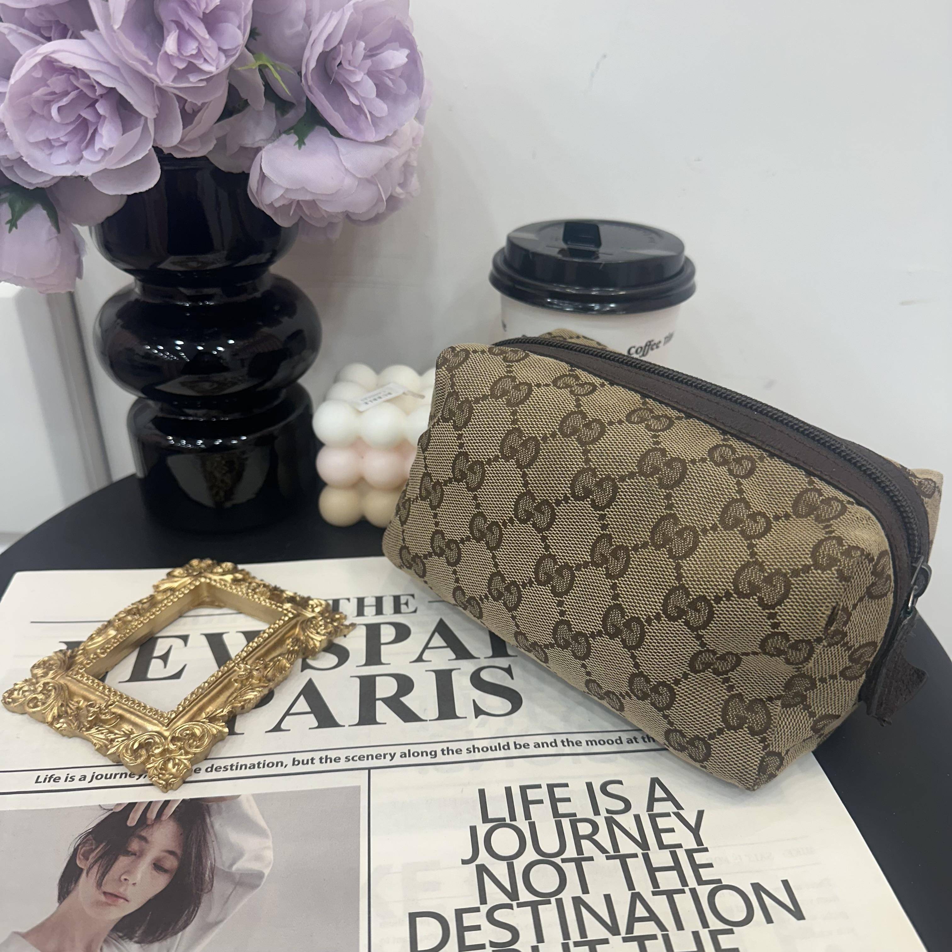 Gucci經典GG老花化妝包,採用米色+棕色GG Supreme帆布,輕便耐用,拉鍊設計超實用!收納化妝品、零錢都很方便💼。復古百搭。