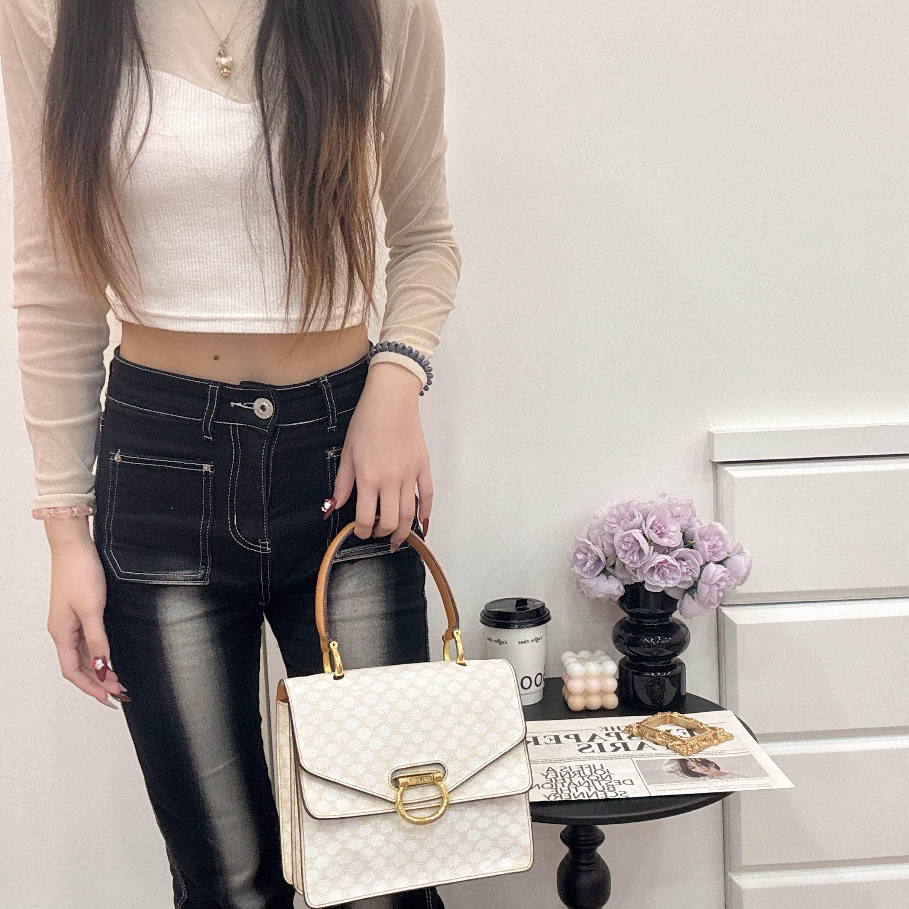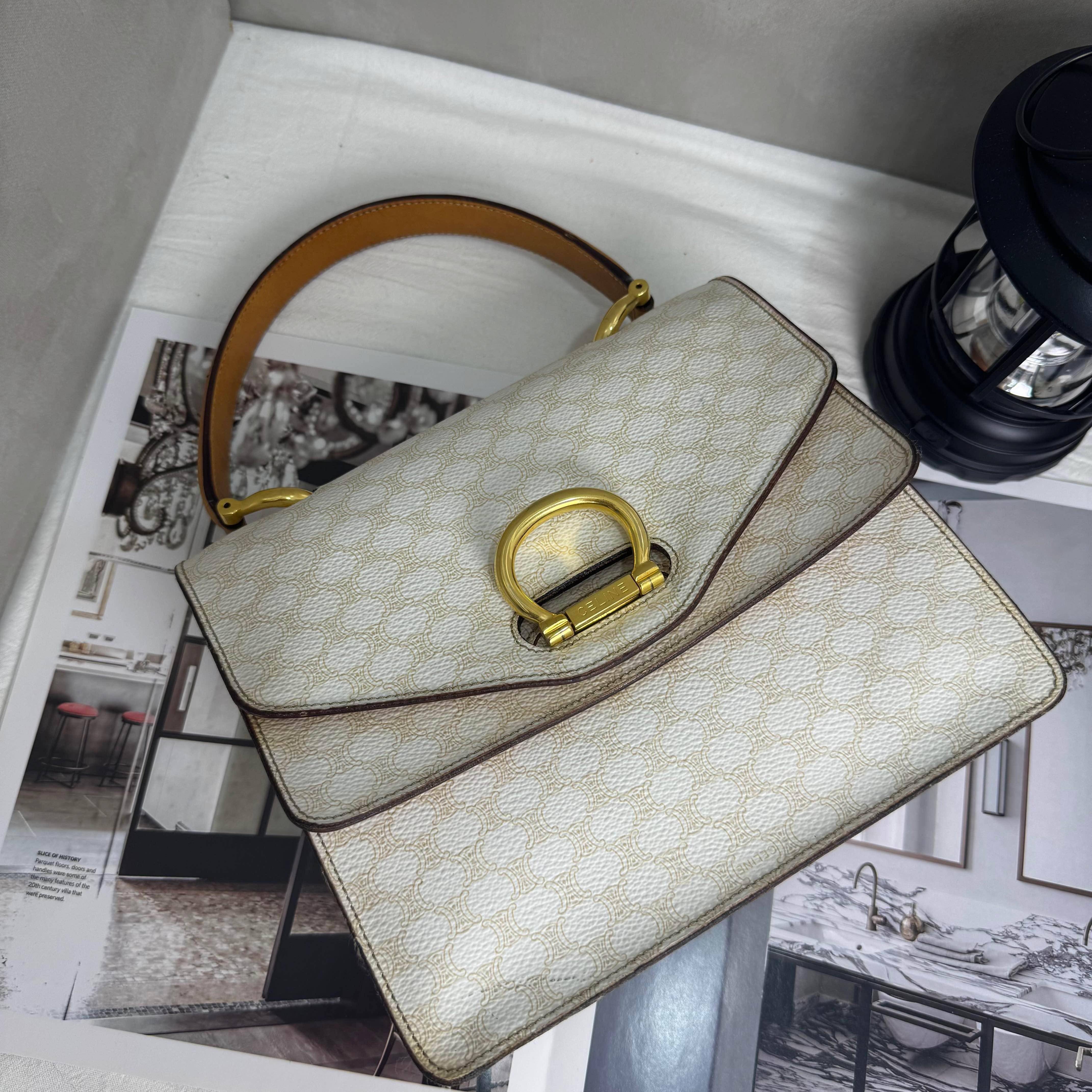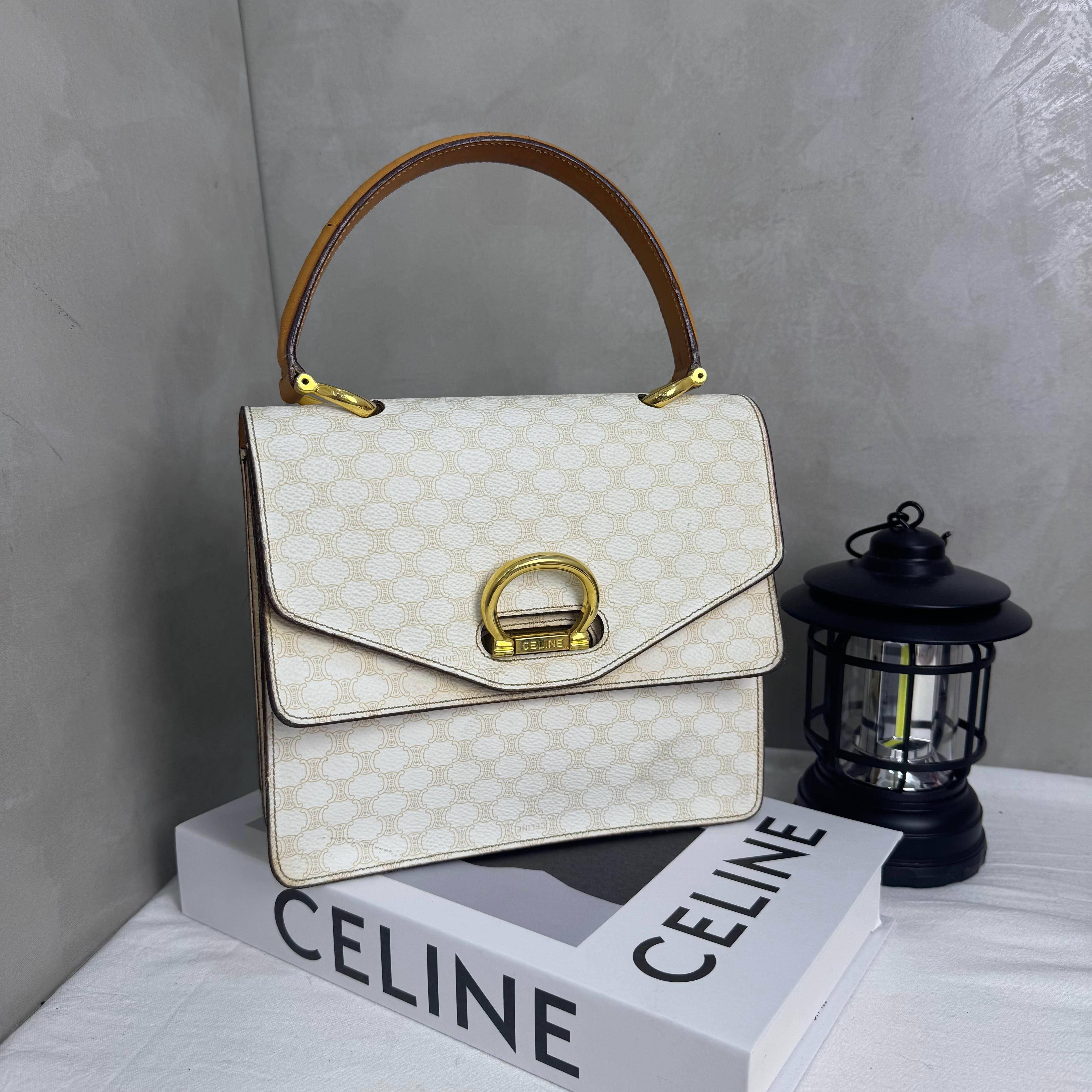 Celine Vintage白色老花雙子星手提包,中古系列經典款,白色老花PVC+棕色皮革手柄,金色馬蹄扣超有辨識度。雙層翻蓋設計,內部空間合理,手提or加肩帶斜挎都OK!白色老花稀有又優雅,復古氣質滿分,日常通勤、優雅穿搭都能輕鬆駕馭,是中古包愛好者必收的寶藏單品。