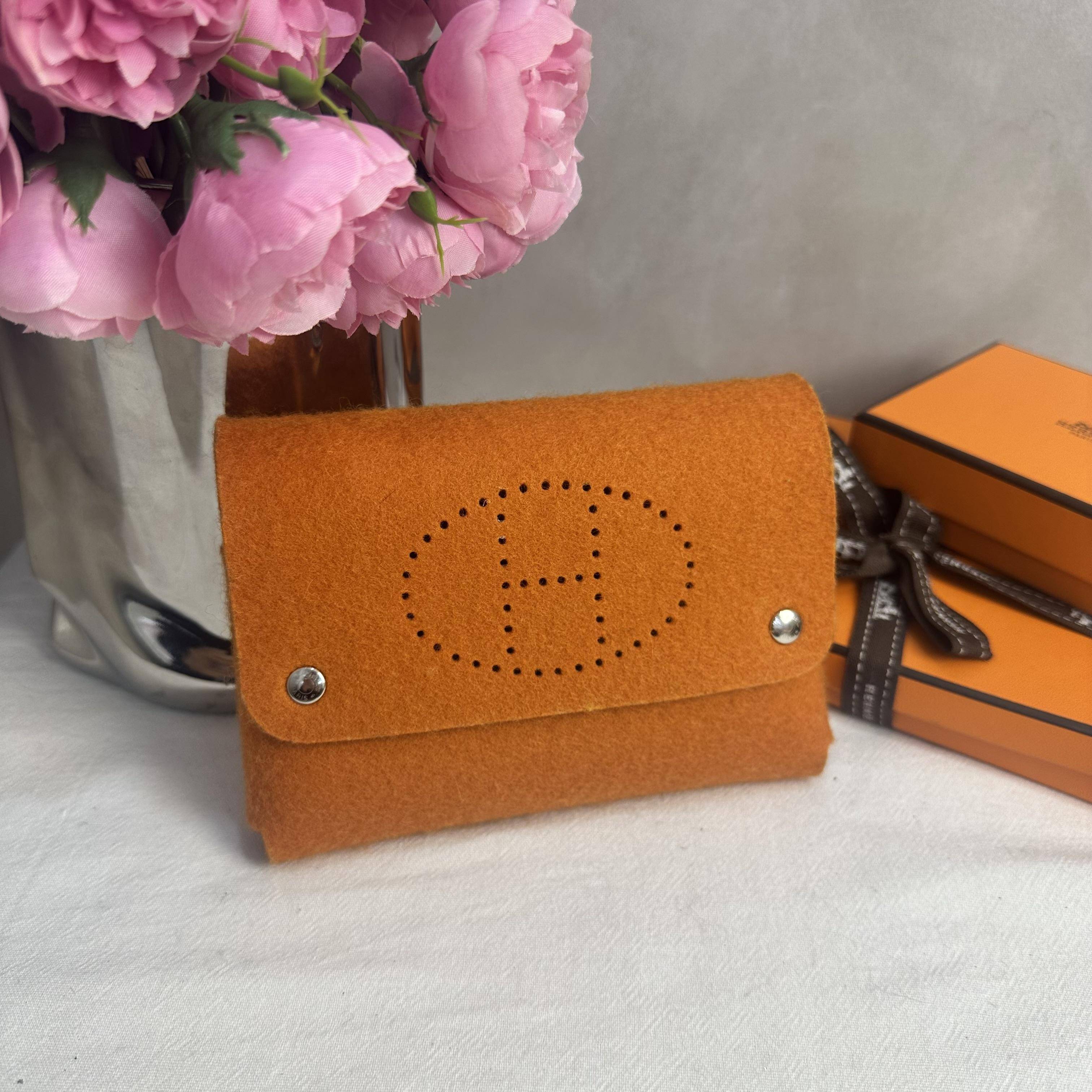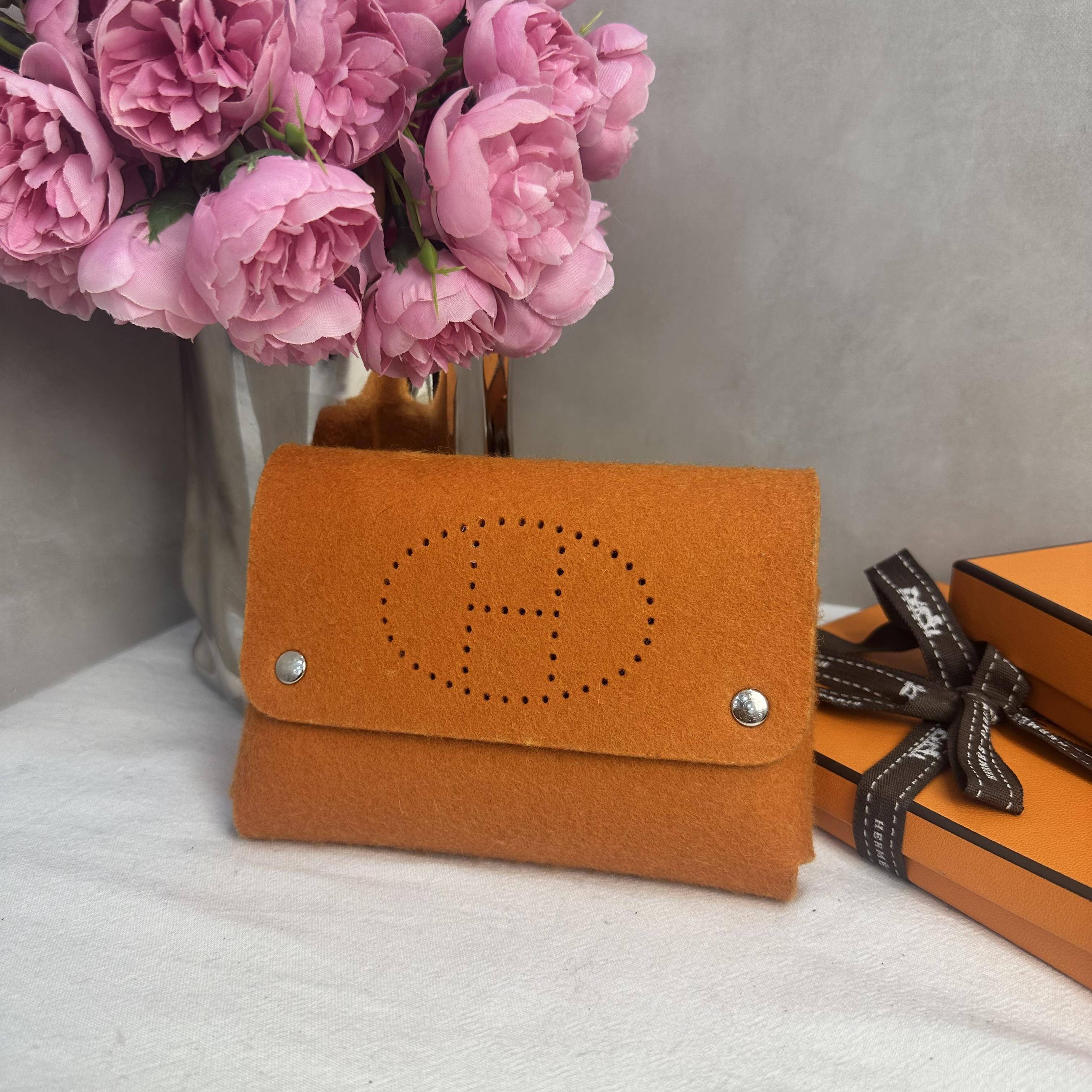這款愛馬仕橙色毛氈撲克包,採用柔軟毛氈材質,正面有經典“H”鏤空標誌,搭配金屬鉚釘,簡約又有辨識度✨。尺寸小巧,適合裝撲克牌或隨身小物,收藏價值高。毛氈觸感獨特,秋冬季節搭配超有氛圍感🍂