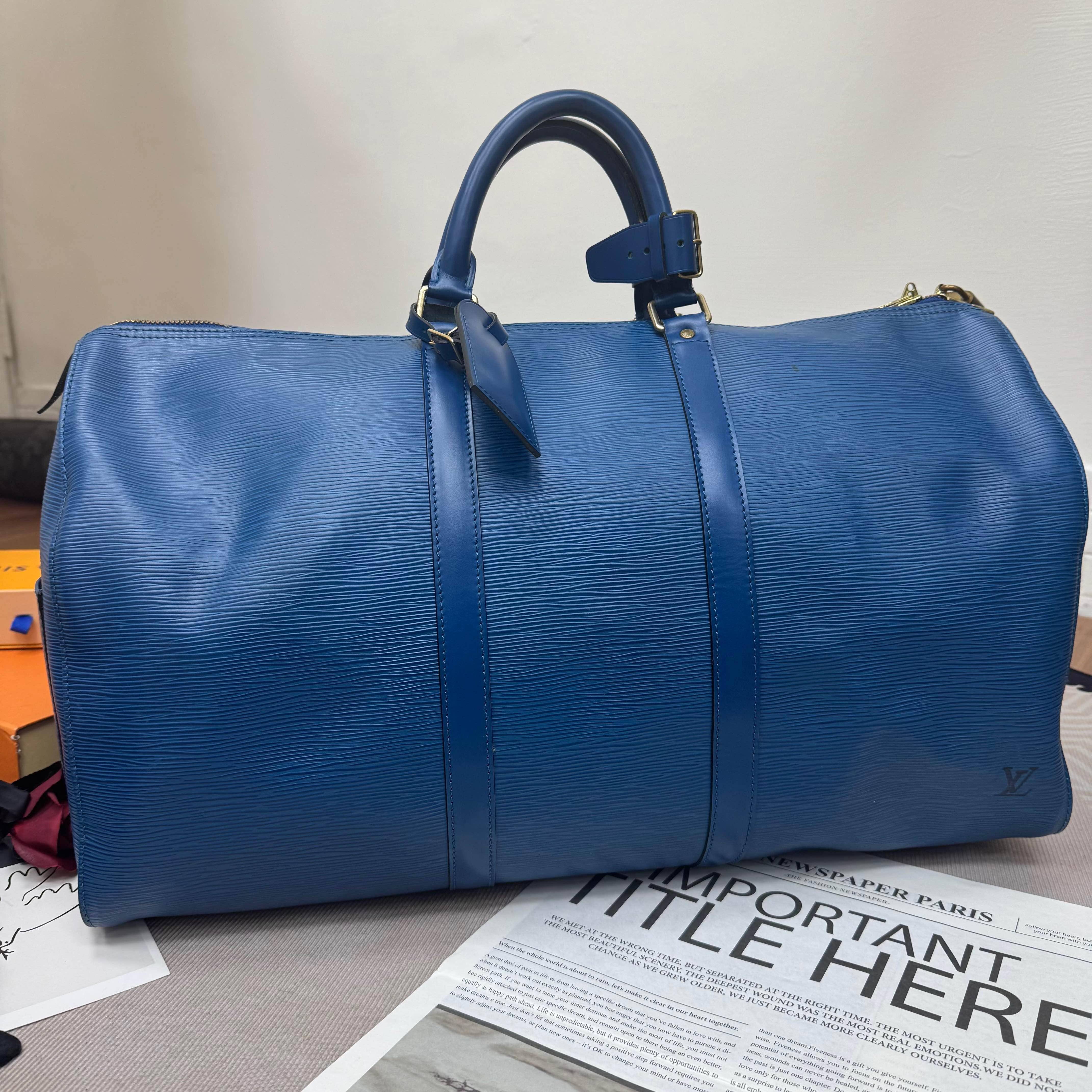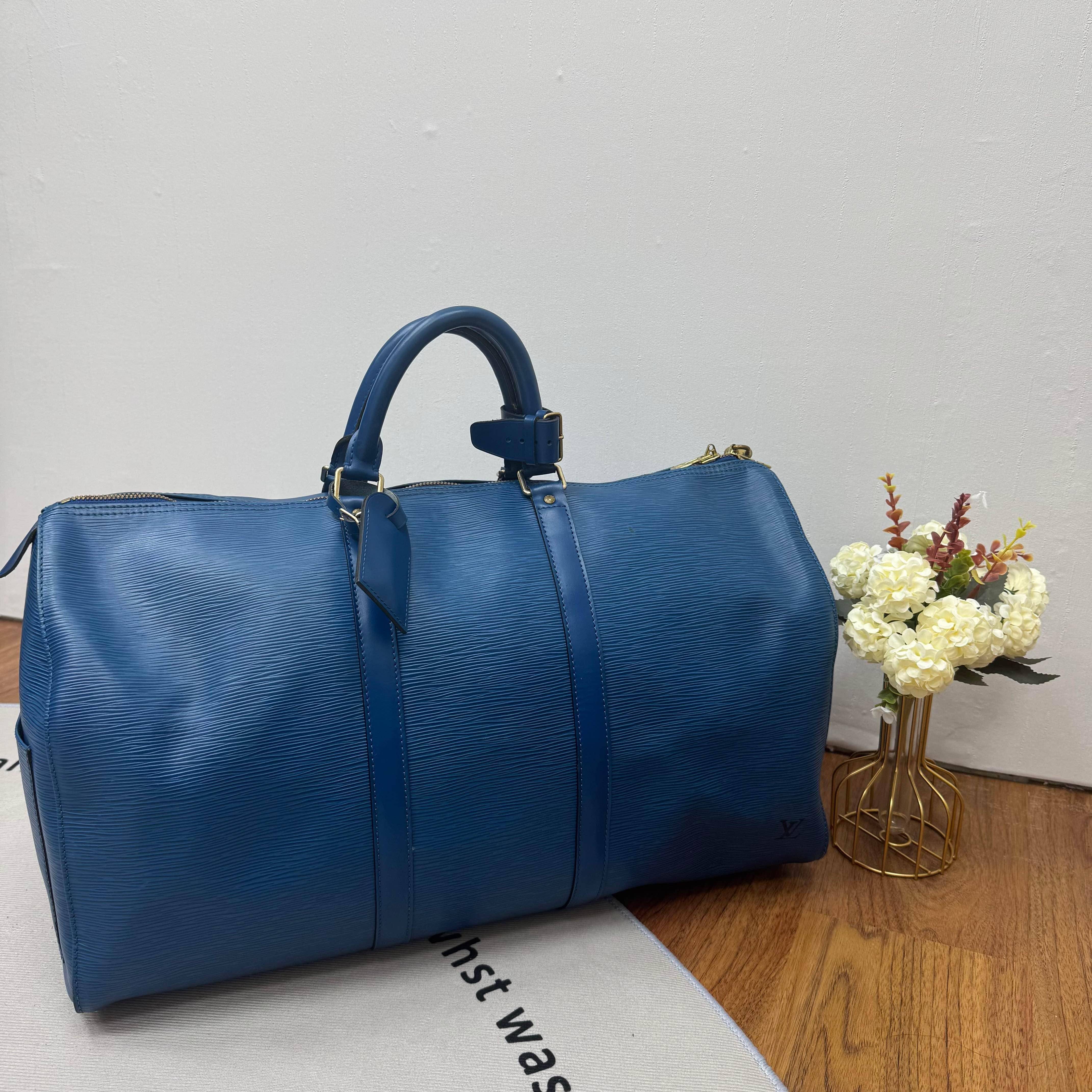 LV Keepall 50藍色旅行袋💙水波紋牛皮材質,耐磨防水,超適合旅行or通勤!50cm大容量,短途出行、健身都能裝下日常用品些。經典圓筒造型+藍色配色,低調又有辦識度,手提肩背都OK,靈活百搭。乾濕分離設計,收納更方便,是實用與時尚兼具的高端旅行包!
