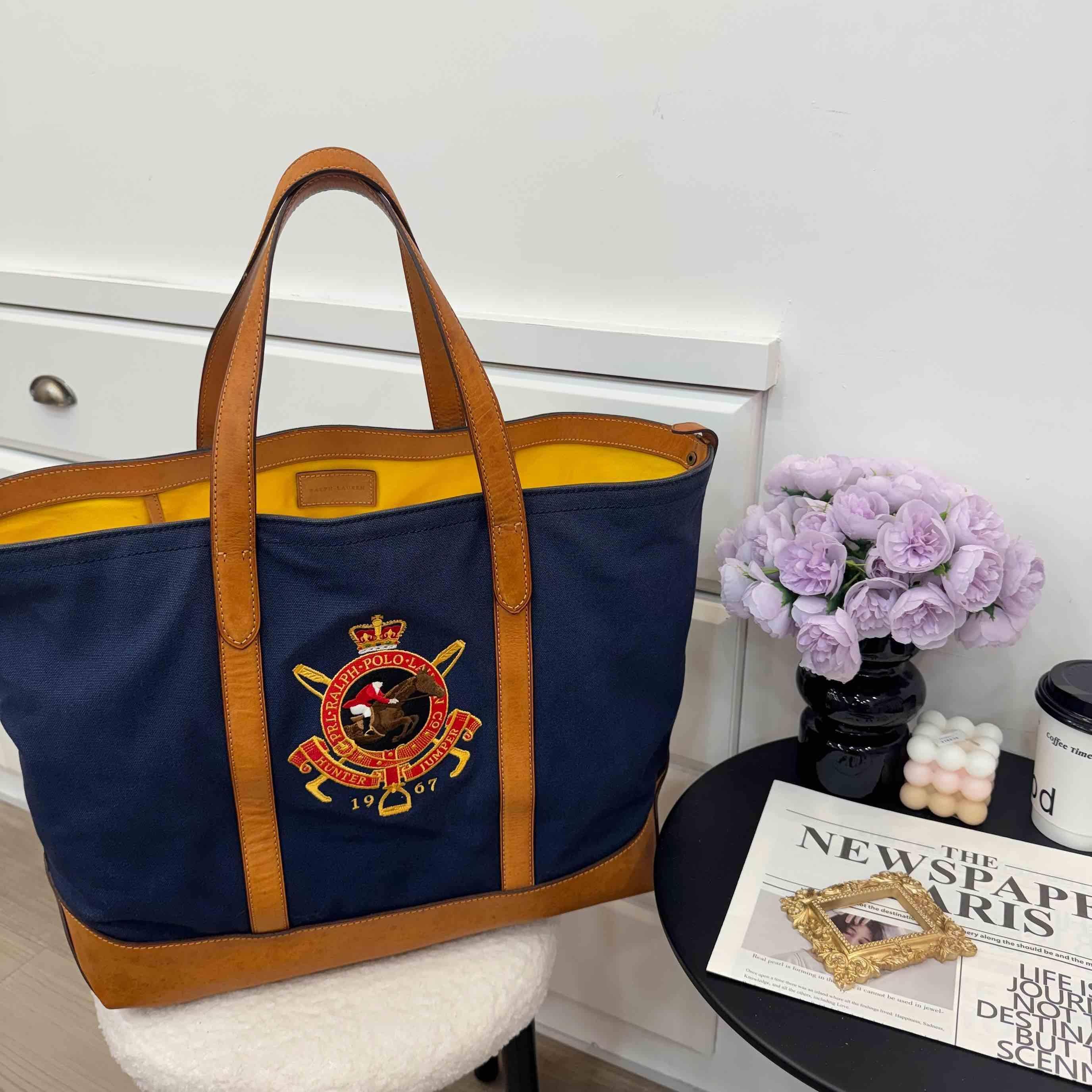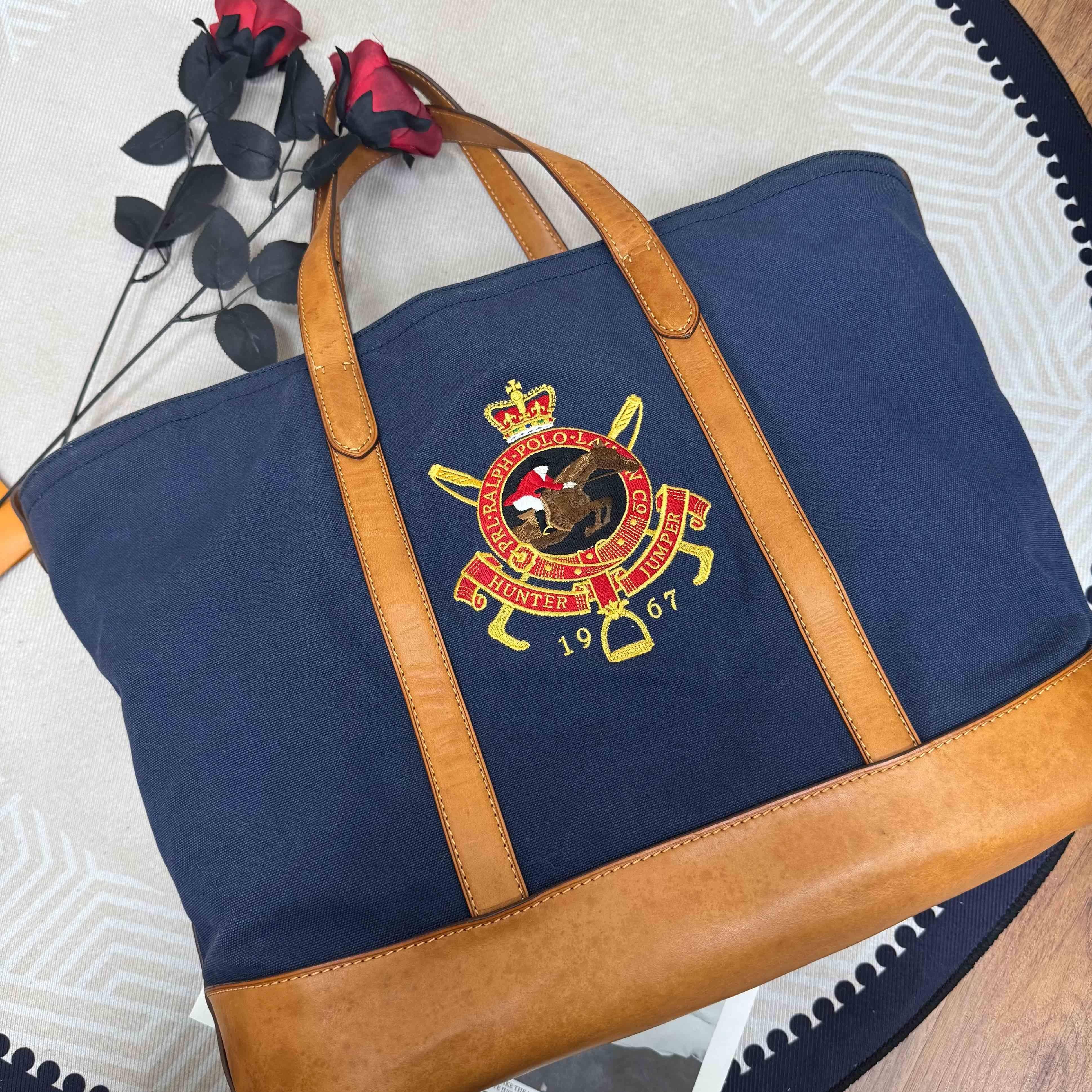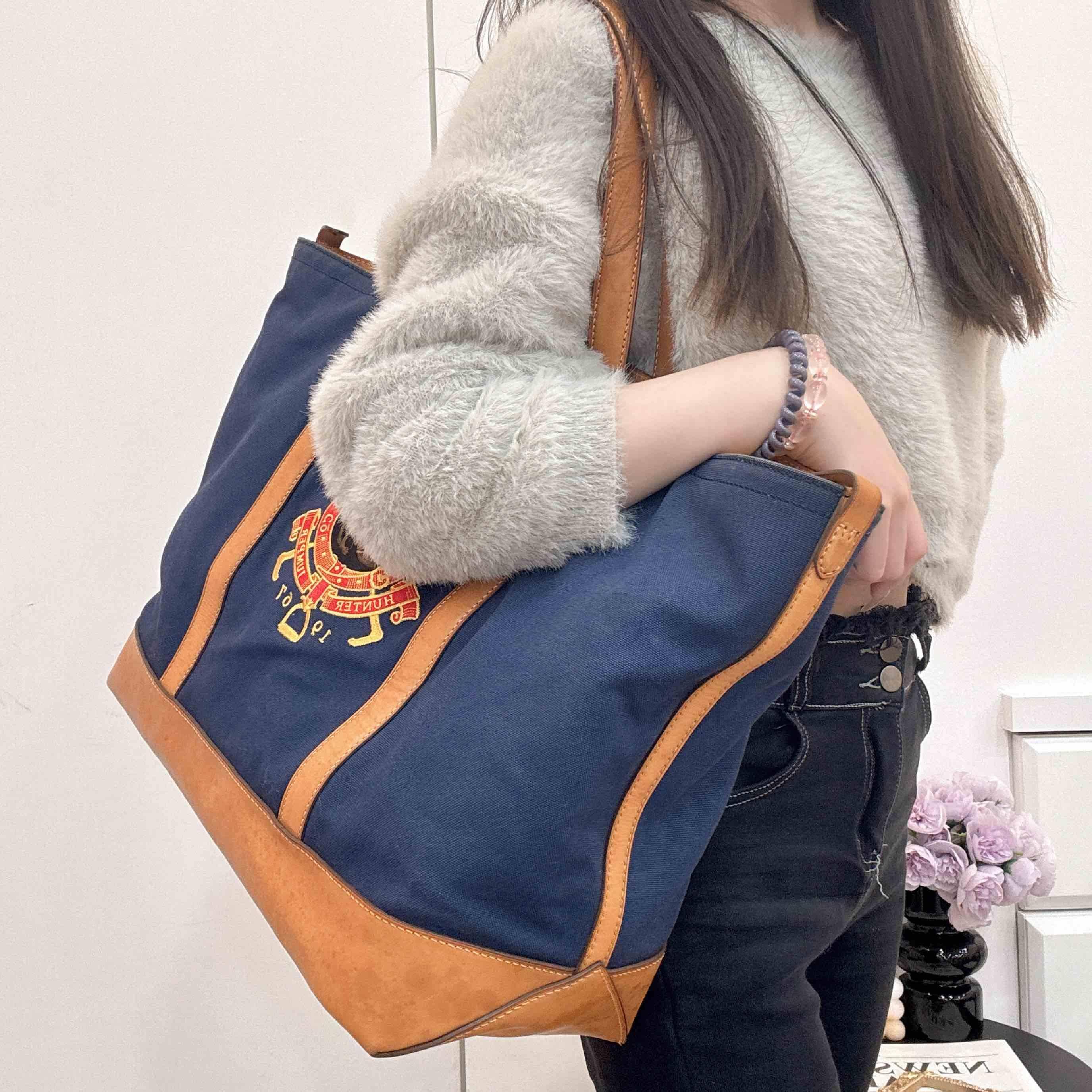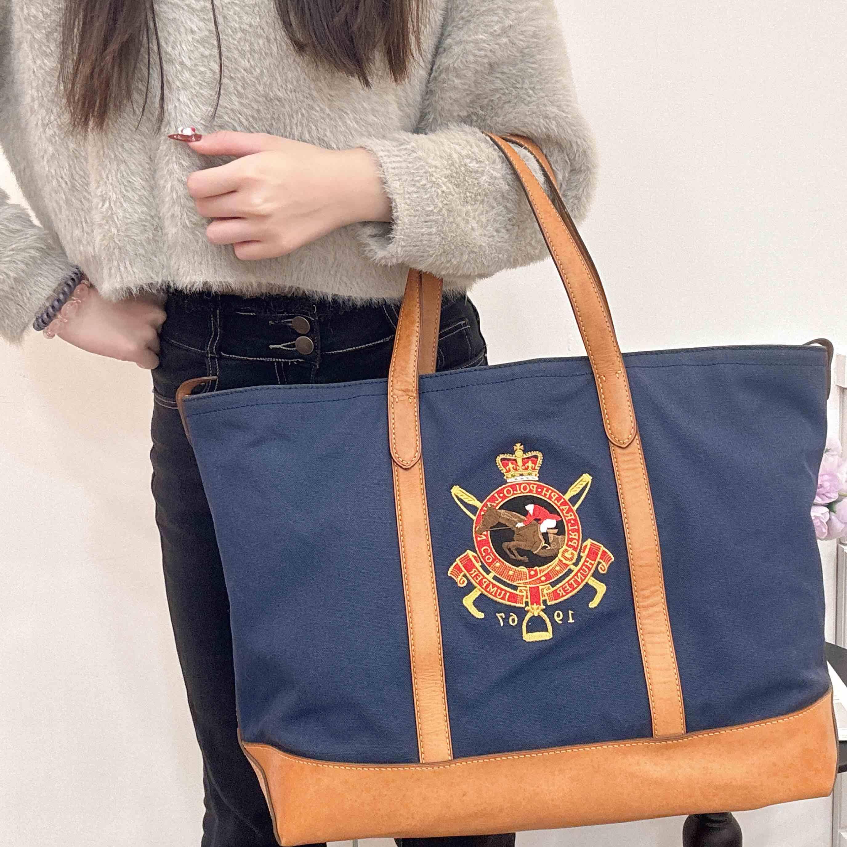 深藍帆布+棕色皮革拼接,簡約復古風滿滿!正面徽章刺繡超有辨識度,英倫學院風細節拉滿。尺寸適中,通勤、短途出行都很OK,內部空間超能裝,日常物品輕鬆收納。皮革手柄耐用又舒適,實用與顏值兼具~~