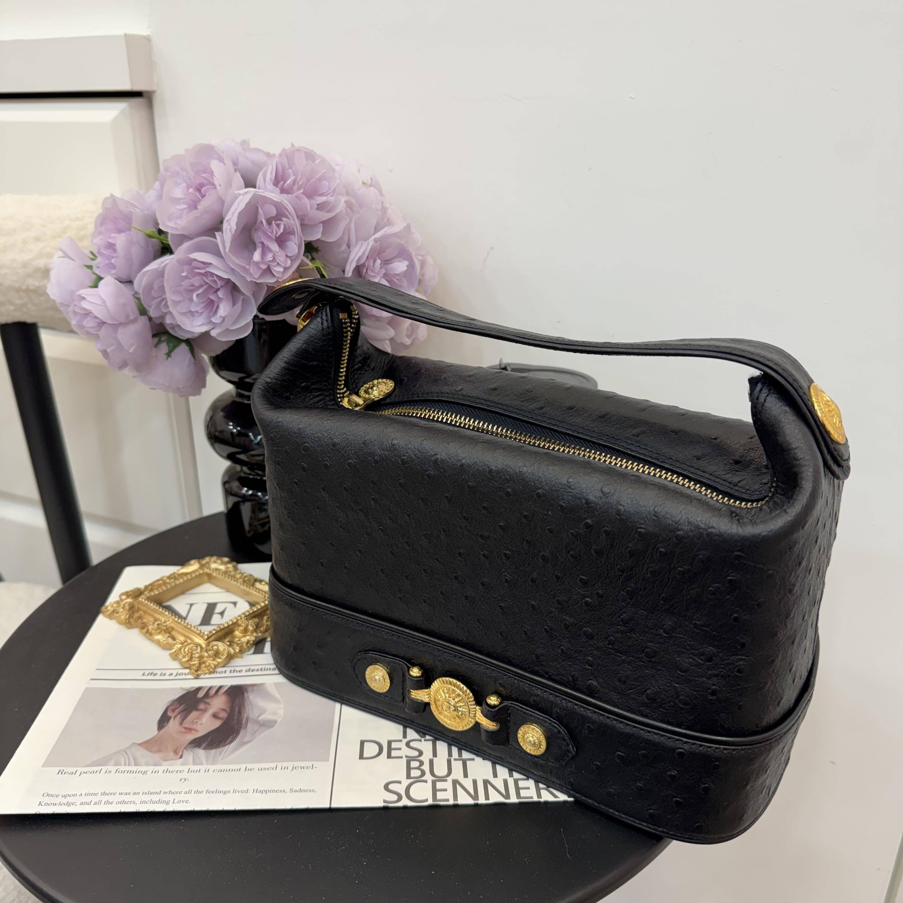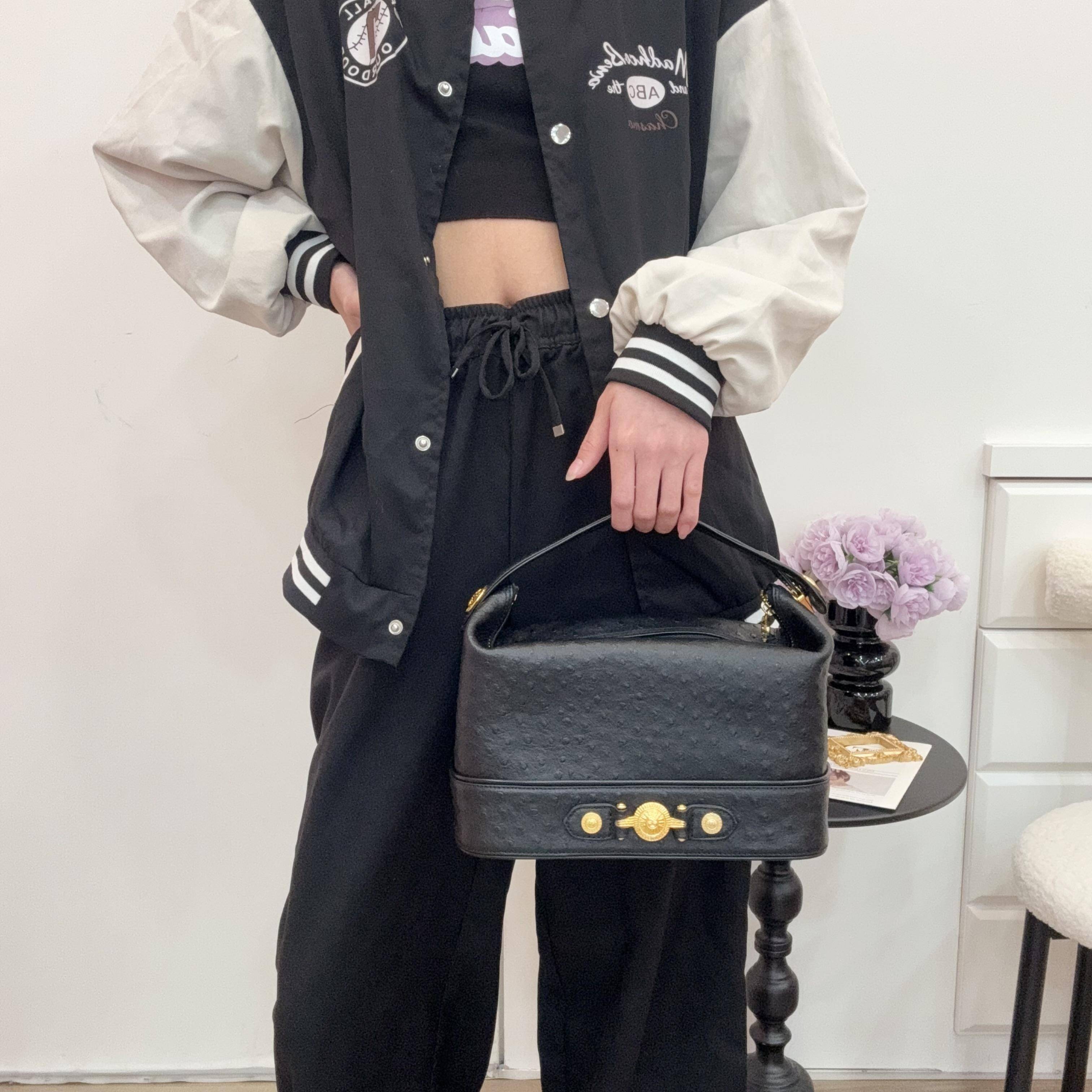 黑金手提包,鴕鳥皮紋理皮革+金色太陽神裝飾,復古奢華感拉滿。矩形包型,尺寸適中,日常或派對都能輕鬆駕馭。內部空間合理,手機、錢包、化妝品都能裝下,實用又時髦!鴕鳥紋肌理+金屬扣件,質感滿分,耐用易清潔,是輕奢時尚必入單品,搭配各種風格都超有範兒。