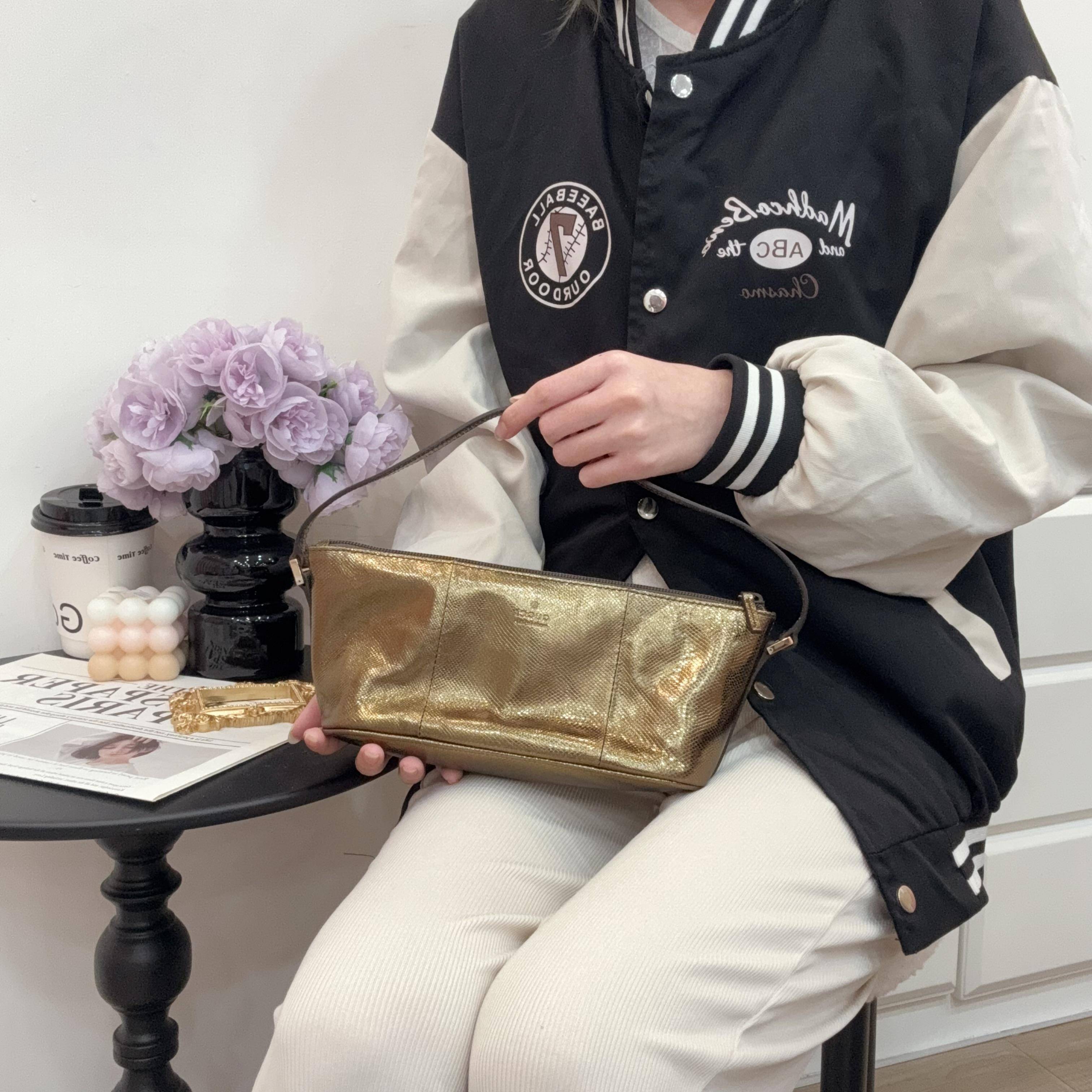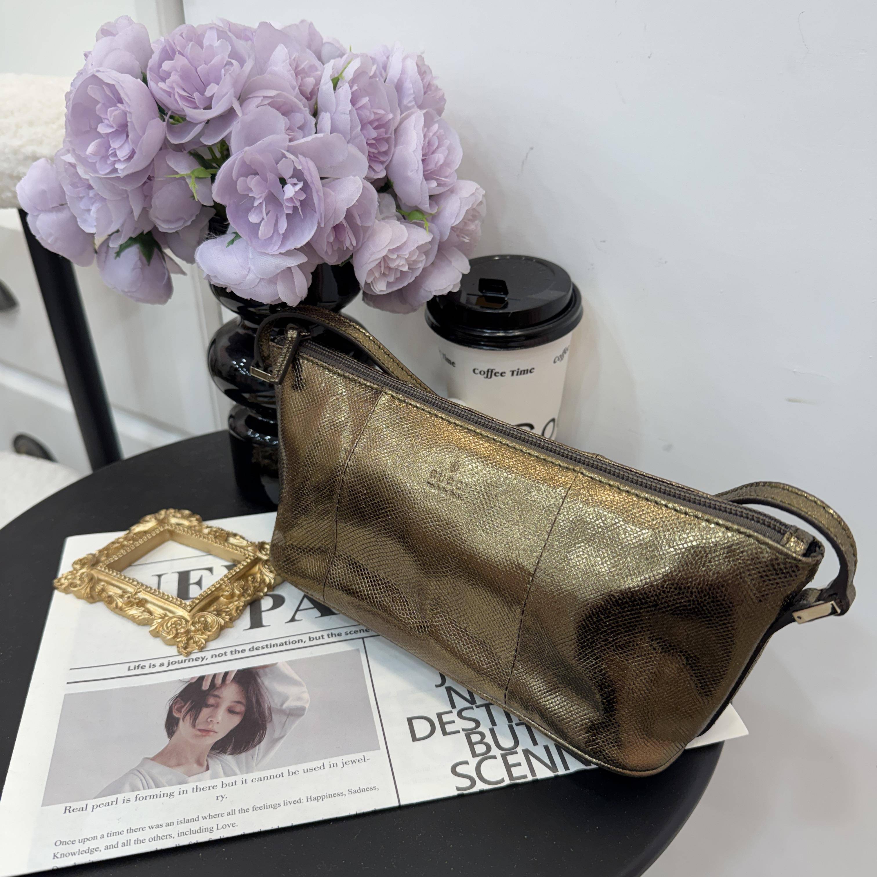 這款 Gucci Boat Pochette 屬於復古(Vintage)包款,水蛇皮(Karung)比起常見的帆布款(GG Canvas)價格更高且更具收藏價值。金屬光澤手拿包,採用蛇紋壓花PU材質,橄欖綠金屬色調超有質感!包身簡約,正面有品牌標誌,拉鍊開合很安全,內部空間能裝手機、鑰匙、卡包等日常小物,通勤或外出都很適合。尺寸剛好,手提或搭配晚宴、休閒穿搭都很出彩,實用又時髦!