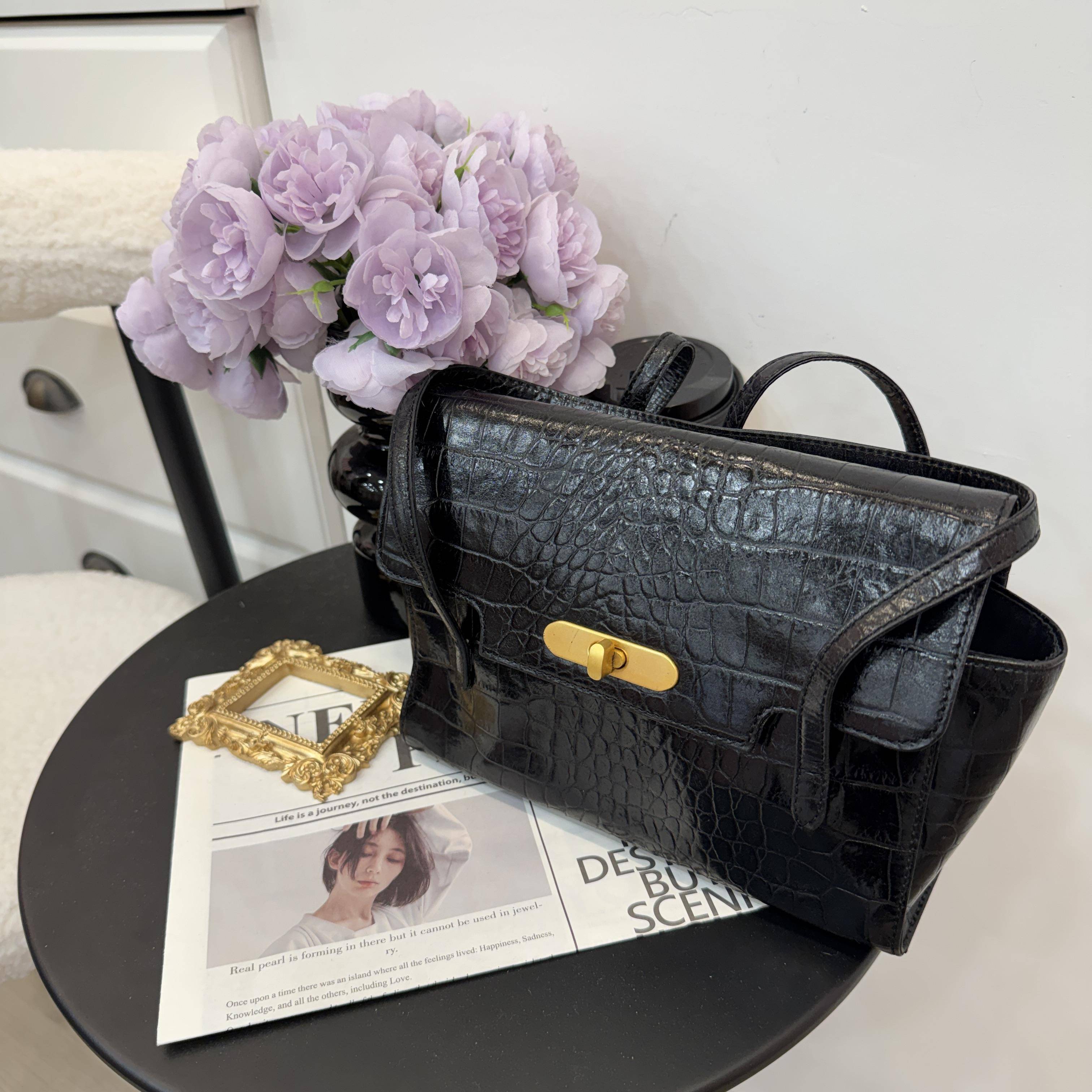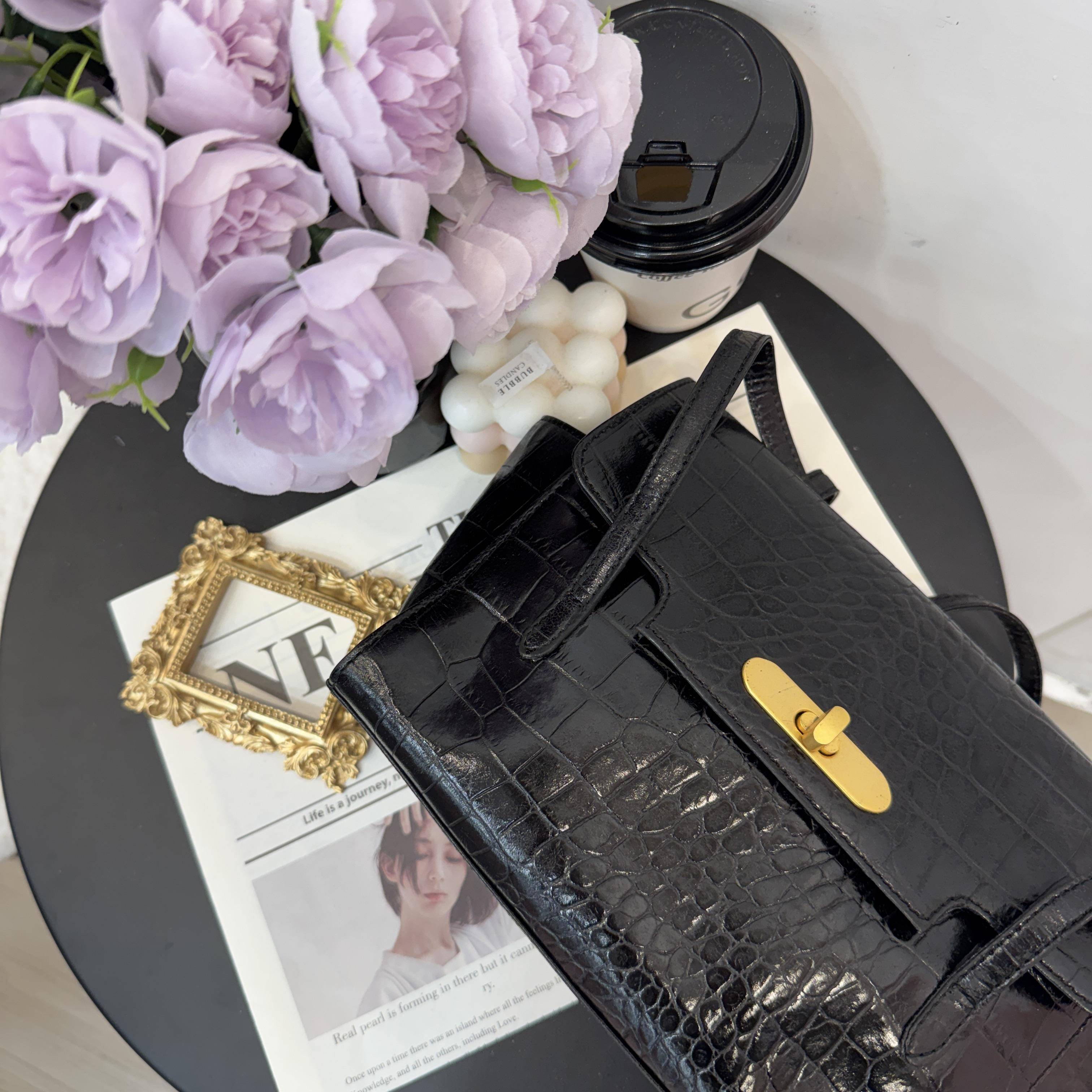 這款手提包採用黑色鰐魚紋亮面材質,光澤感滿滿,質感高級。矩形包型+雙提手設計,手提肩背都OK,通勤日常都能用!細節感拉滿。鰐魚紋理超有辨識度,搭配簡約或正式穿搭都很出彩,輕鬆提升造型精緻度。