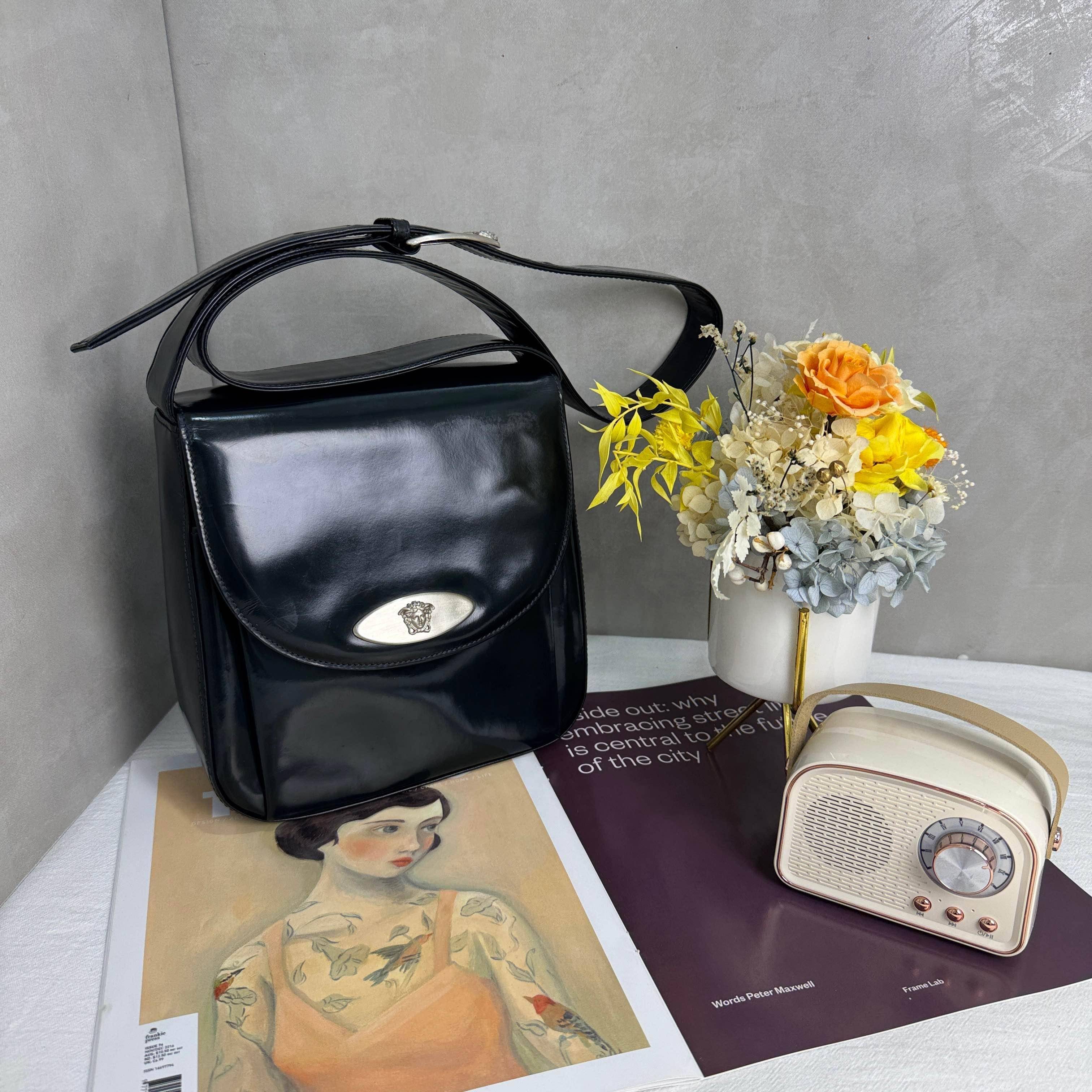 🖤Versace經典黑色漆皮包,亮面漆皮材質,金屬Medusa徽章超有辨識度。簡約包型+可調節肩帶,單肩斜挎都OK,日常通勤、休閒出街都能輕鬆駕馭。黑色百搭,怎麼搭都好看,實用又有品牌感,是Versace標誌性單品之一!