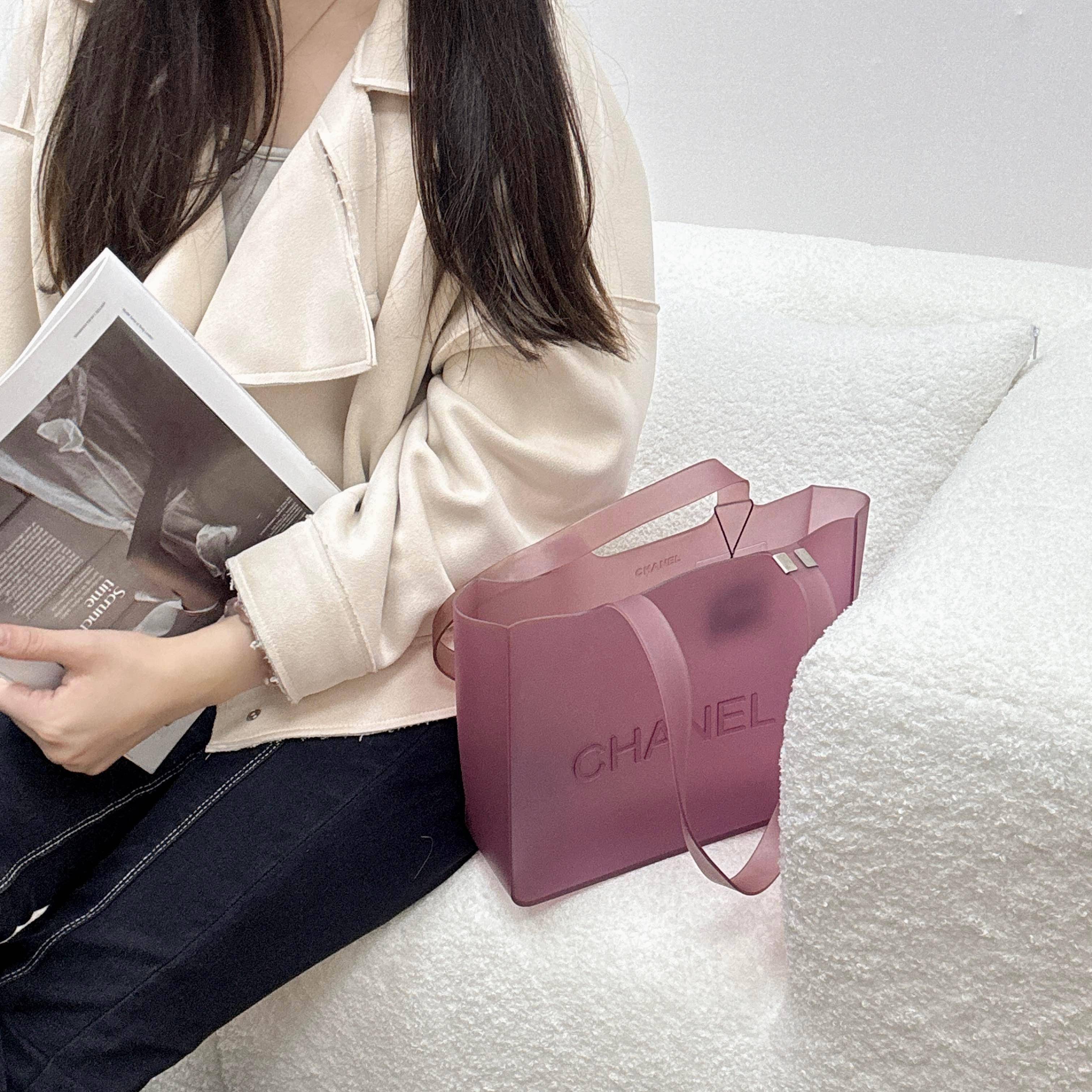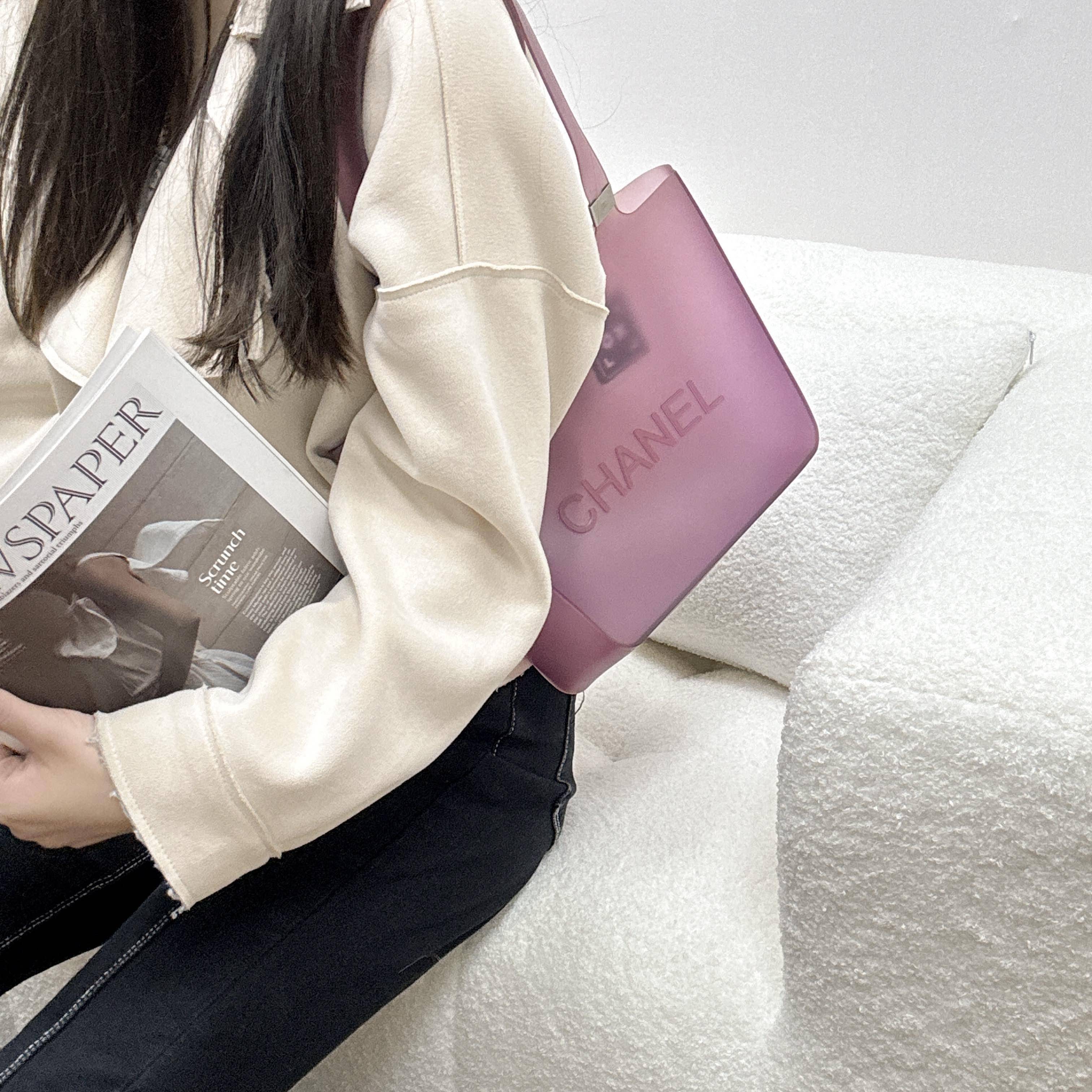 香奈兒中古果凍包,採用PVC材質,淡紫玫色超有夏日氛圍感!包身簡約,正面“CHANEL”標誌,底部鏤空設計很有辨識度✨。輕便耐用,適合通勤或夏日出行。PVC防水易清潔,沙灘、海邊都很實用⛱️。中古系列稀有,收藏價值高,低調優雅,搭配夏日穿搭超加分!