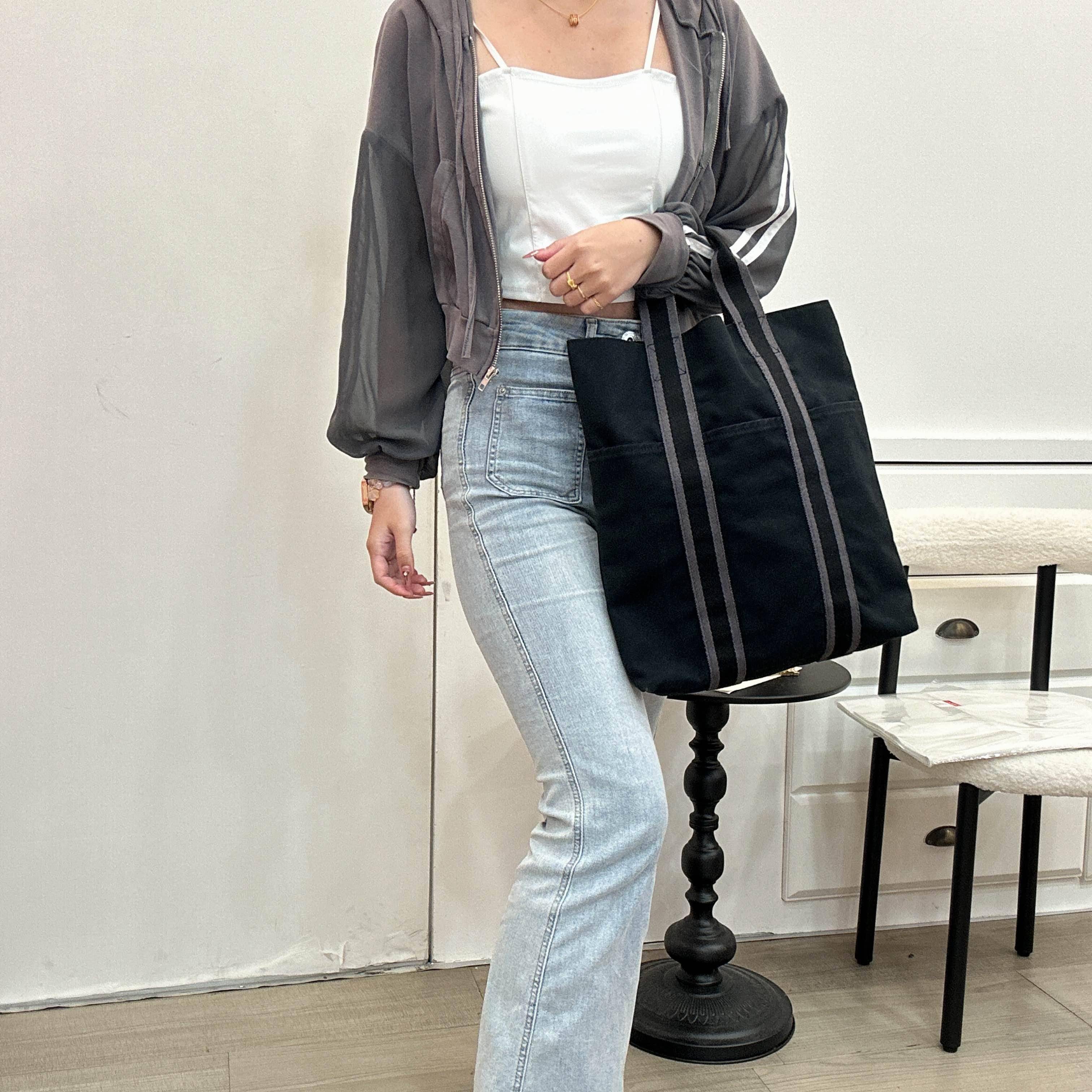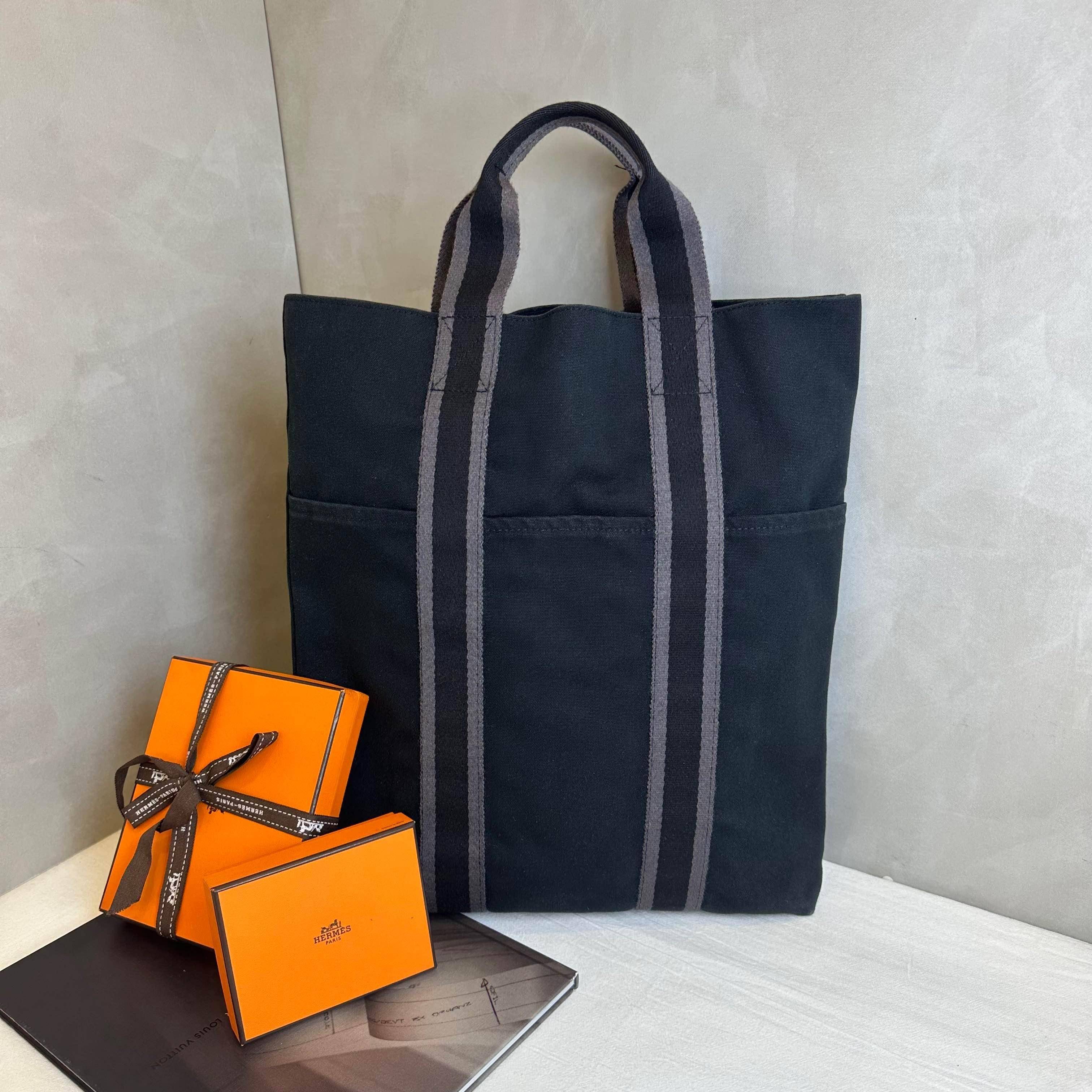 這款 Hermès 絕版托特包,以厚實棉質帆布結合經典條紋織帶,展現簡約洗練的中性魅力。縱向長型設計兼具優雅與大容量,輕鬆收納日常所需。無論是通勤或休閒穿搭,都能襯托出內斂而不凡的精品品味,是值得收藏的日常首