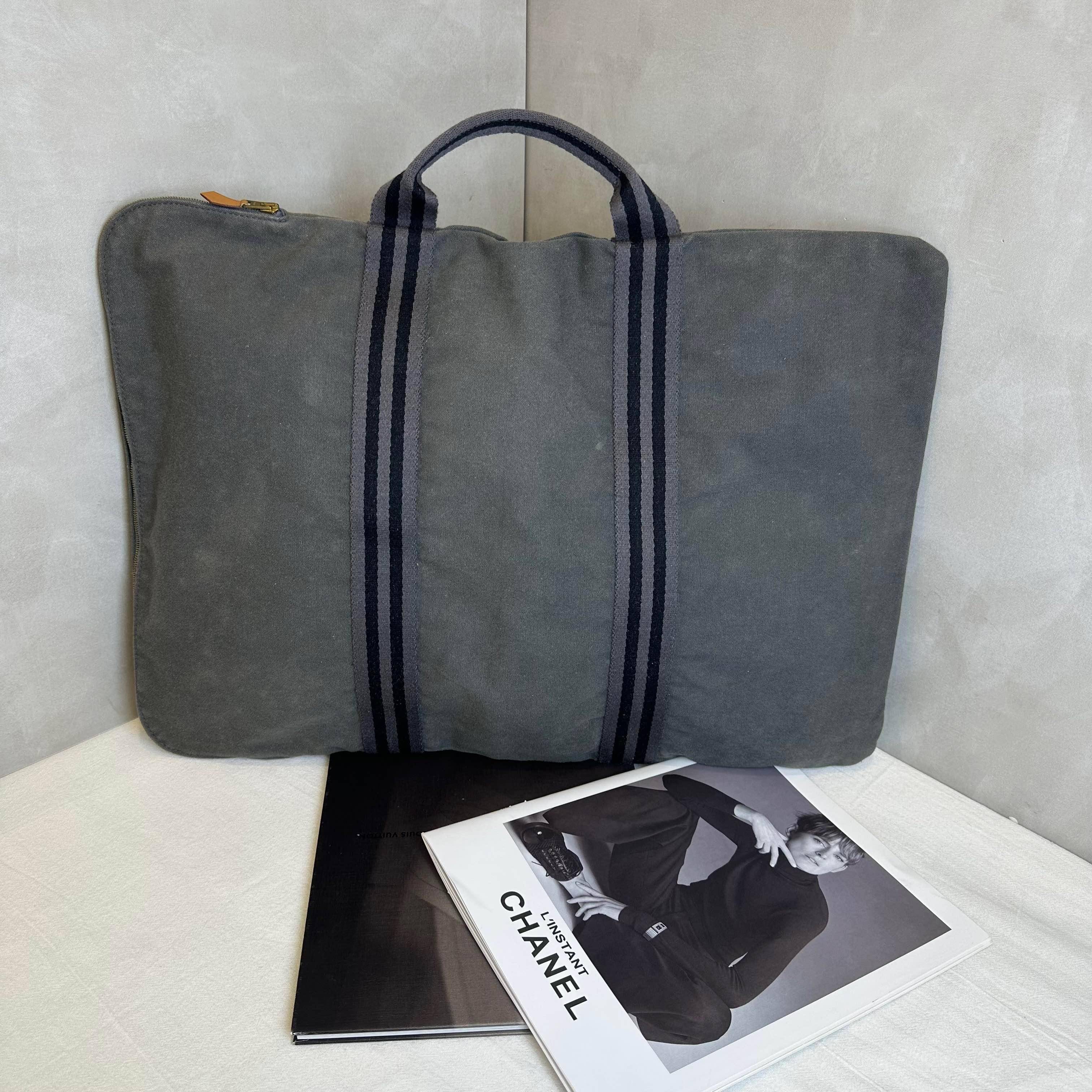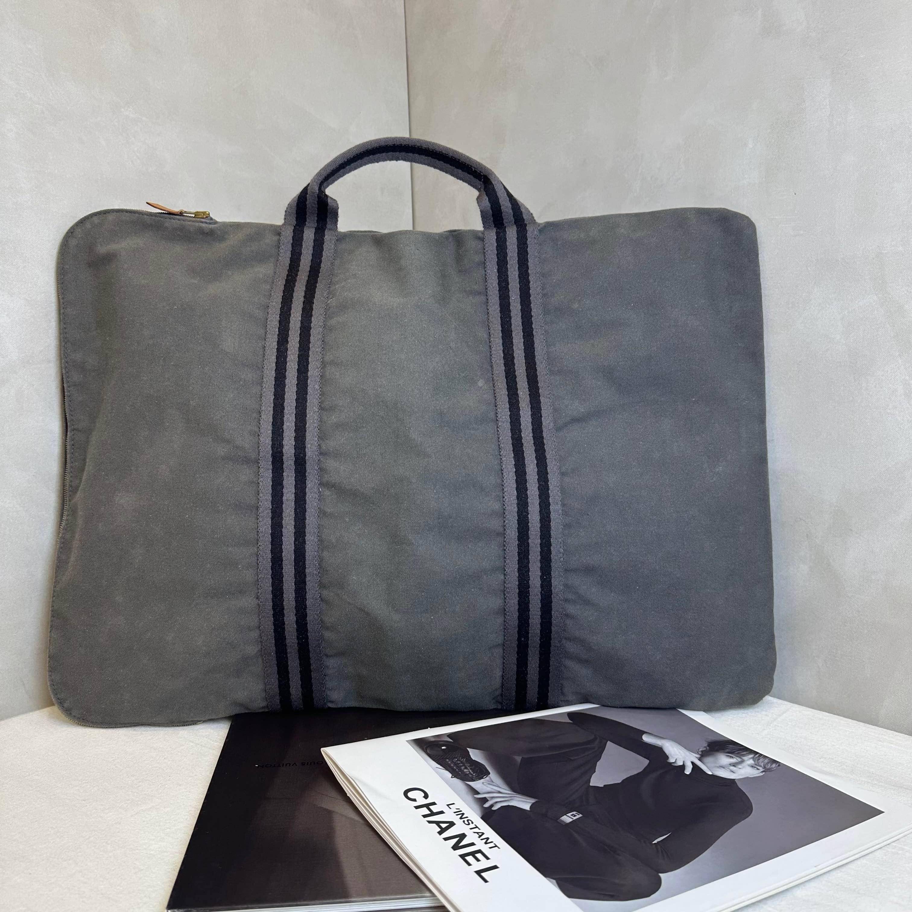 這款 Hermès Fourre Tout 公事包,以極簡灰色帆布揉合經典編織條紋,盡顯低調的法式優雅。其輕盈耐用的特性與大容量開口設計,完美平衡商務專業感與日常實用性,是追求質感品味的職人首選。