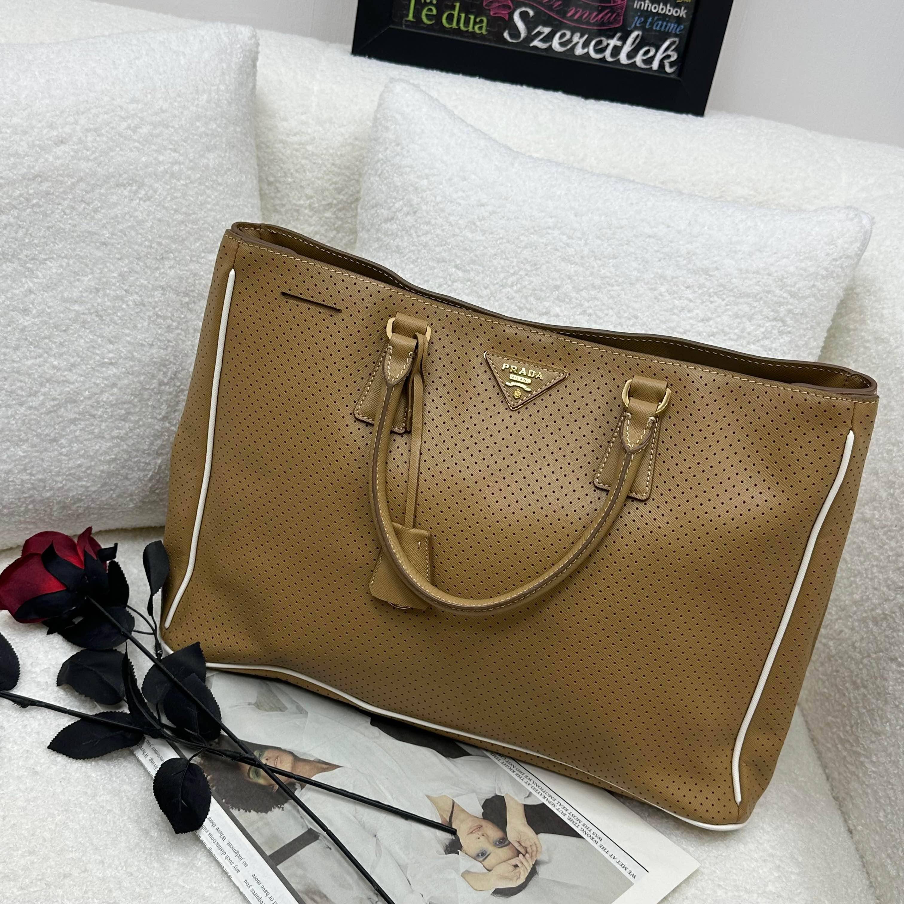 PRADA Saffiano Fori 托特包,以經典防刮牛皮結合精緻鏤空設計,奶茶色調溫柔優雅。白色滾邊勾勒簡練線條,超大容量完美收納日常。不僅是通勤首選,更是展現從容品味、低調奢華的時尚單品。