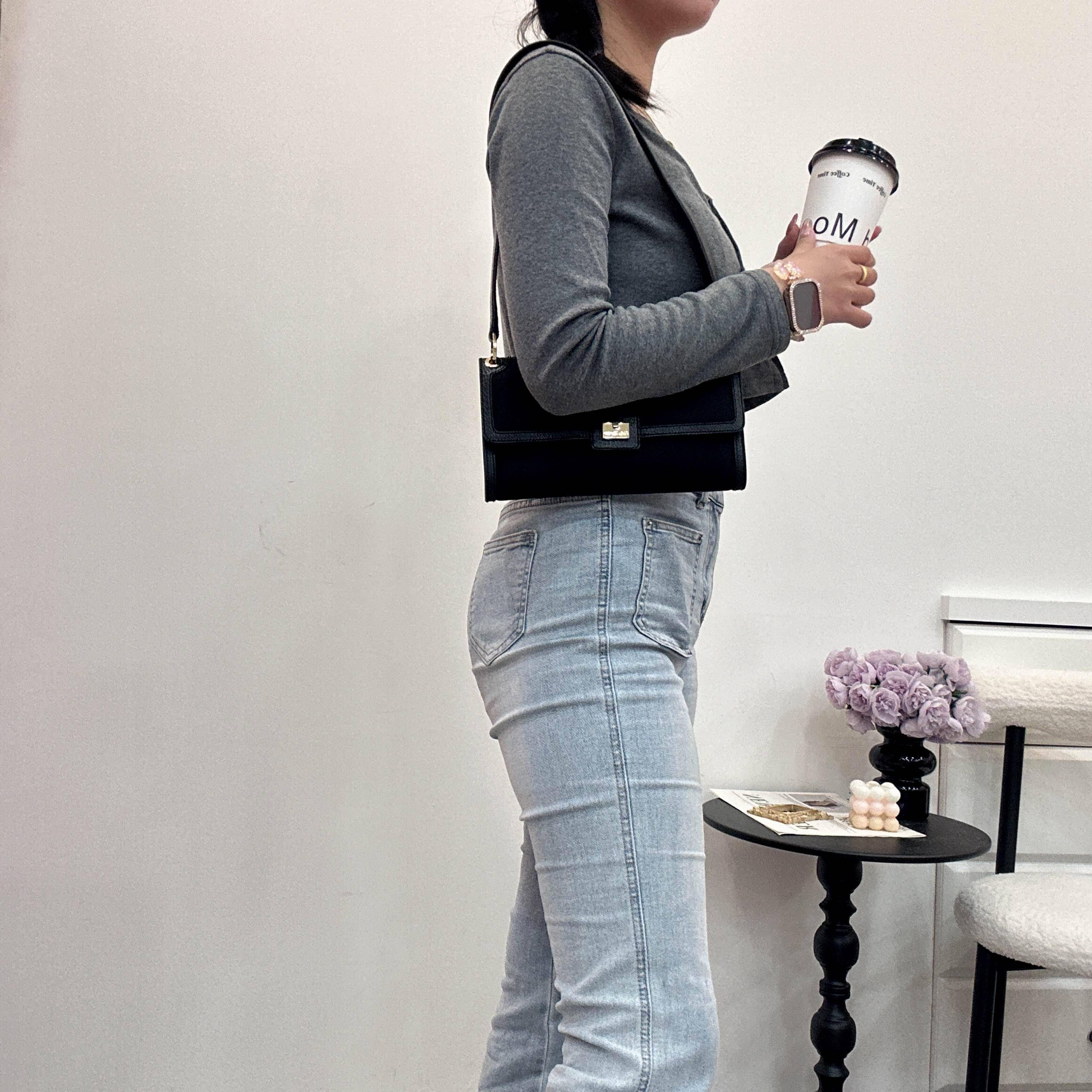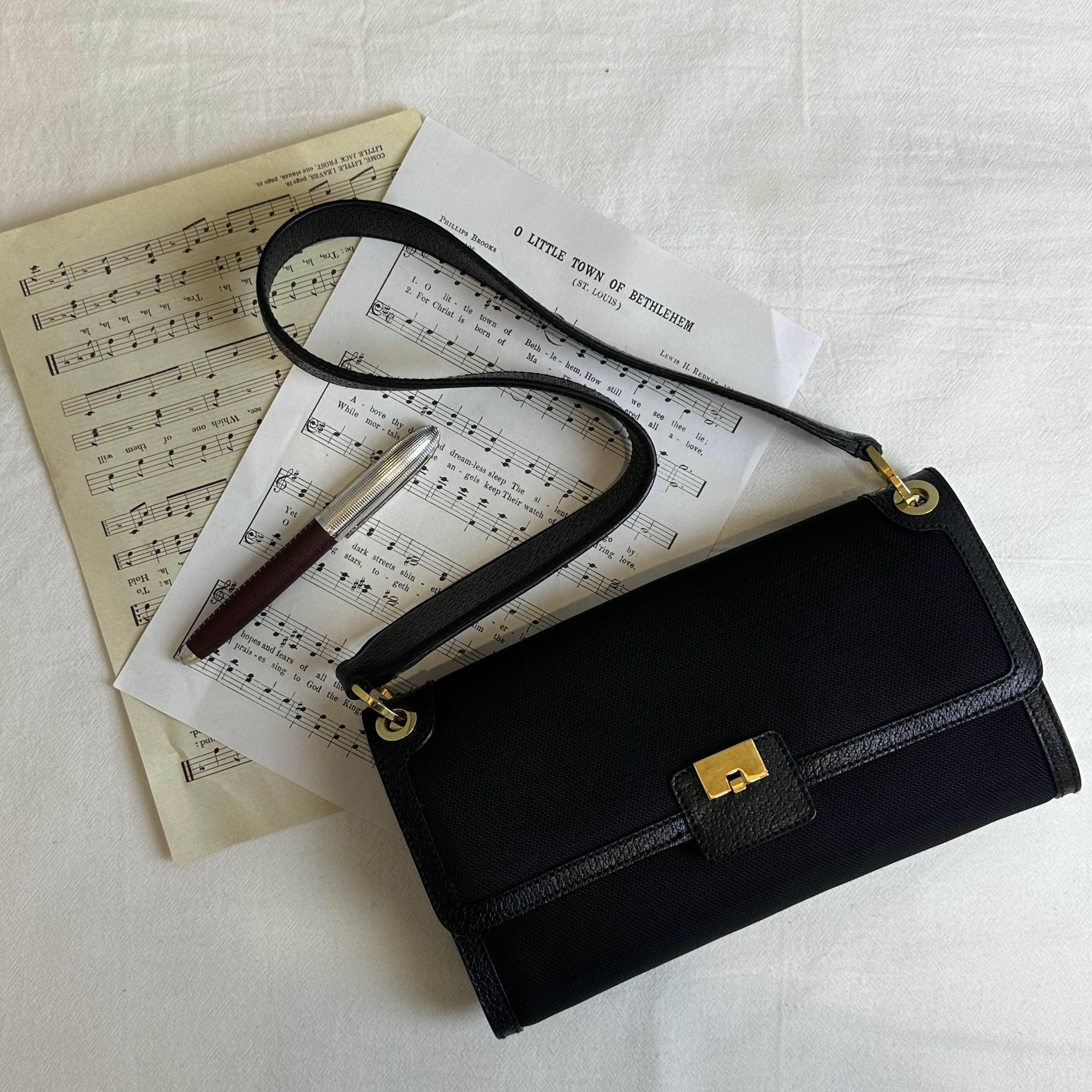 這款包包展現出極致的低調奢華。黑色帆布與皮革滾邊相得益彰,搭配精緻的金屬轉扣,在簡約中流露不凡品味。細長的肩帶設計優雅大方,無論是日常通勤還是晚宴聚會,都能輕鬆駕馭,成為造型中畫龍點睛的點綴。