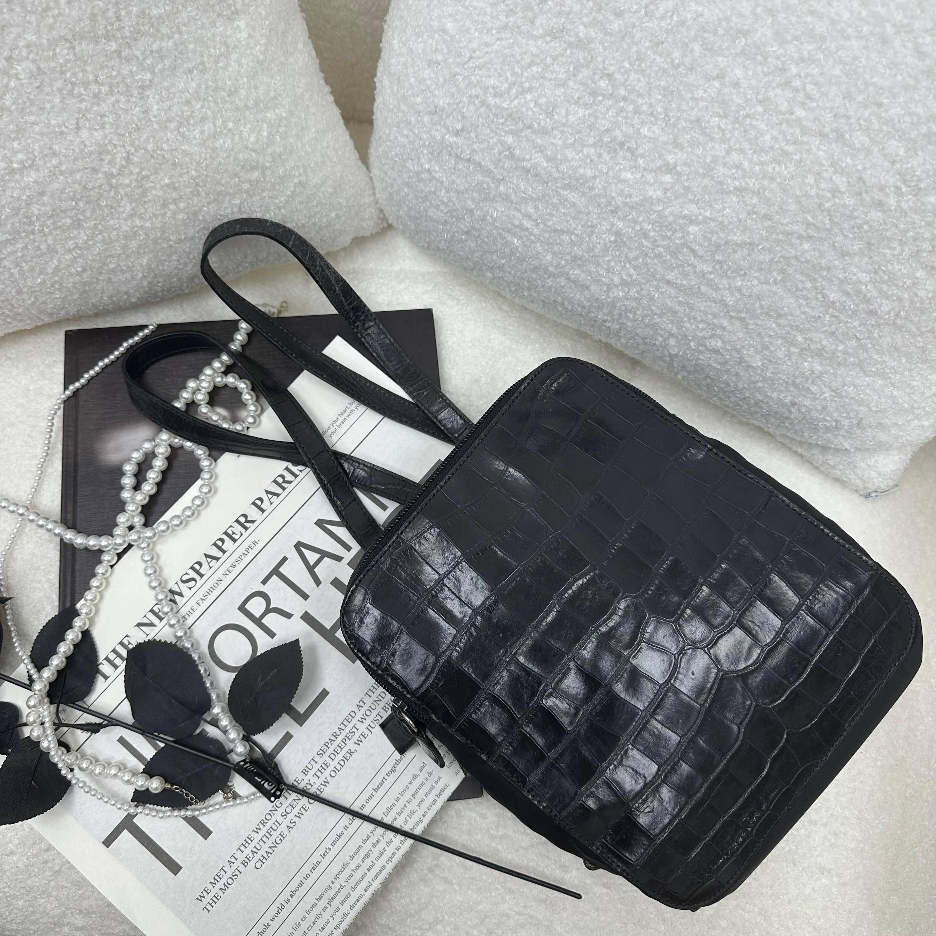 這款包以深邃黑鱷魚壓紋盡顯鋒芒,立體方塊紋理與亮面皮質交織出低調的奢華感。結合硬挺方形剪裁與異材質拼接,在極簡與霸氣間取得完美平衡,是追求獨特品味與都會質感的品味之選。