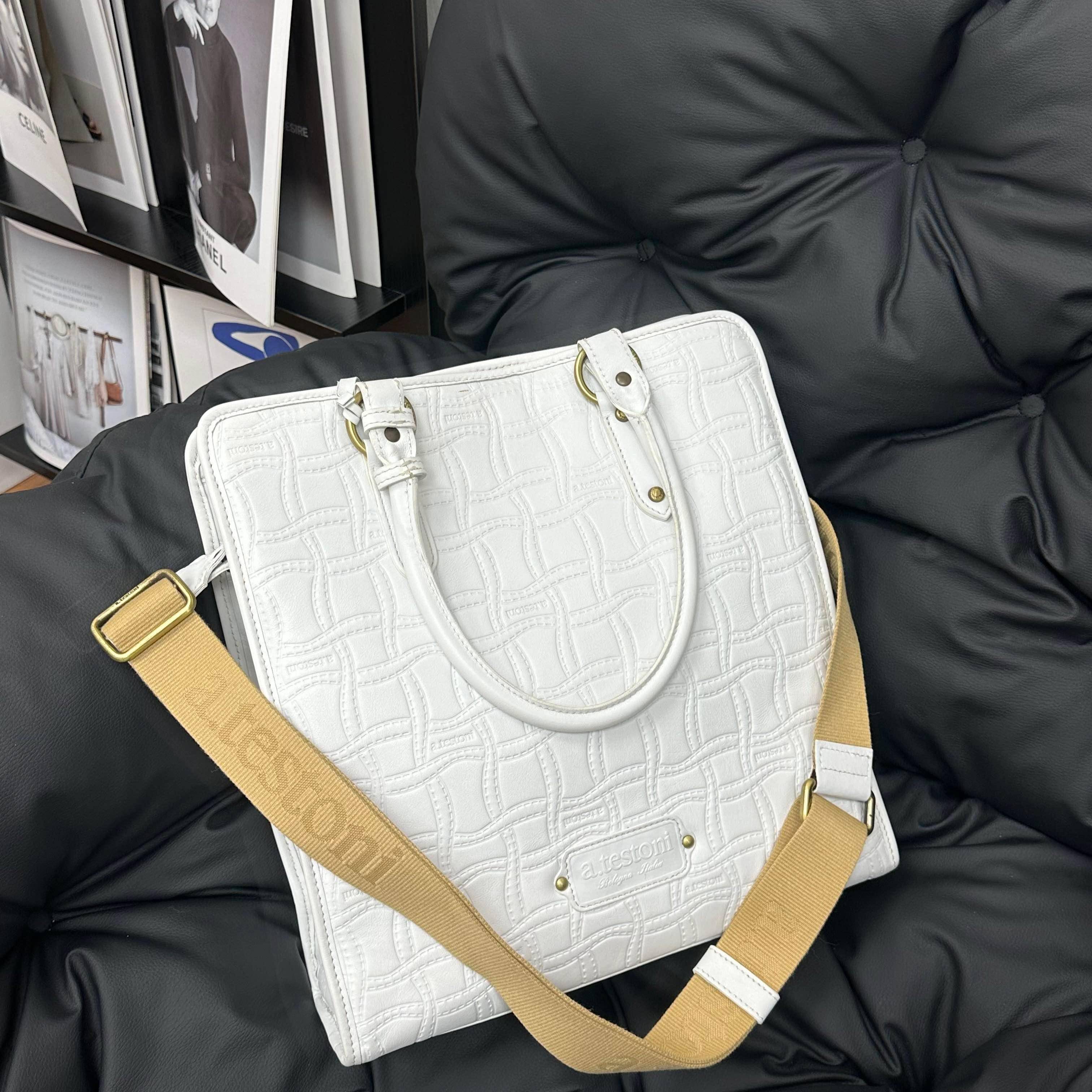 以純白皮革揉合標誌性幾何壓紋,盡顯義大利工藝的細膩與雅致。簡約方正的廓形搭配經典金屬銘牌,於低調中流露奢華質感,是追求品味與專業形象的都市女性,日常穿搭中最優雅的點睛之筆。